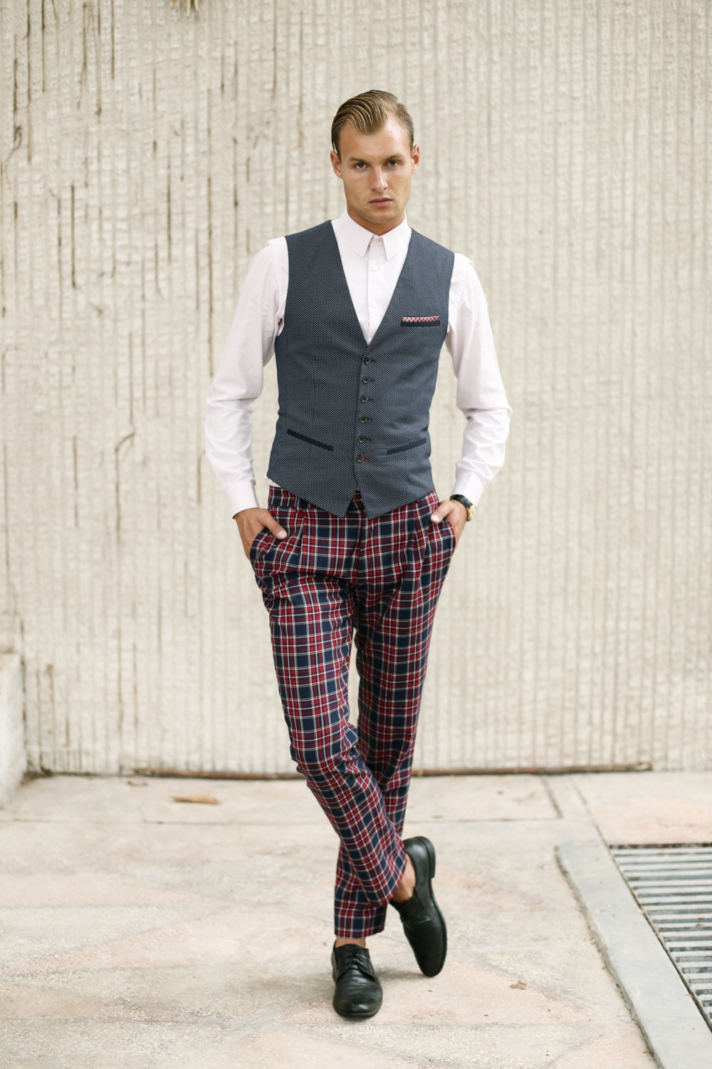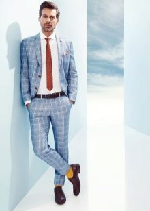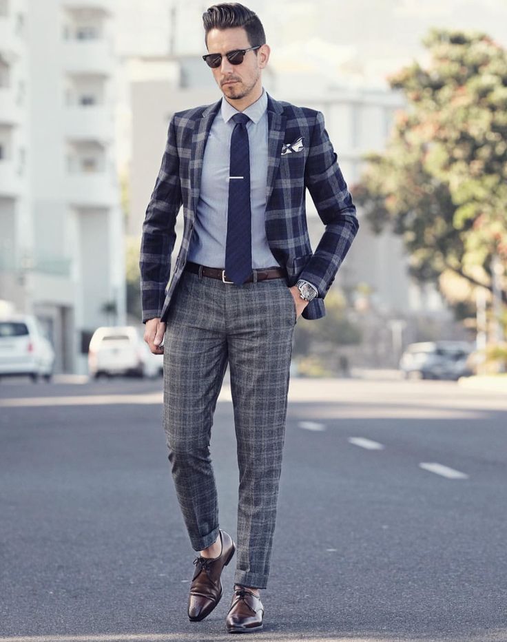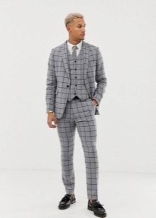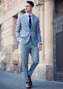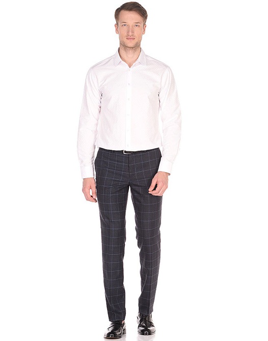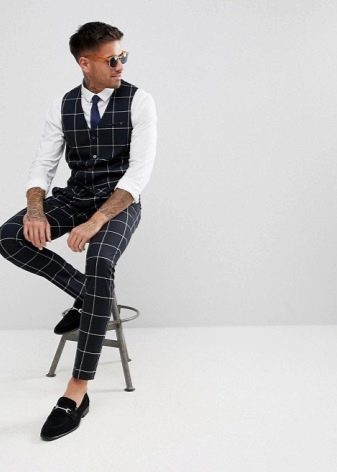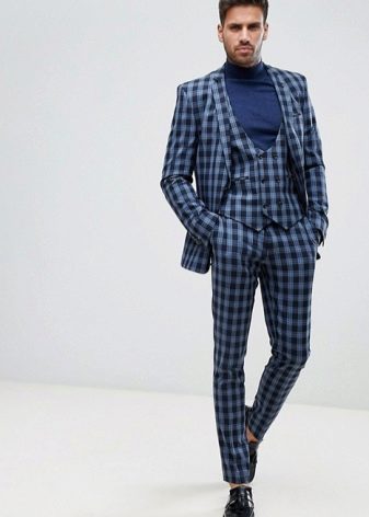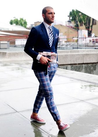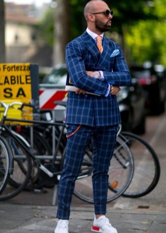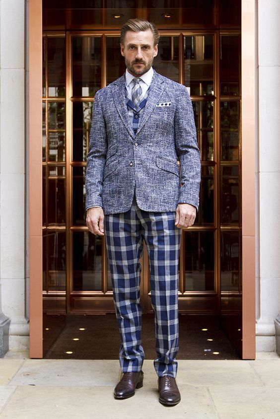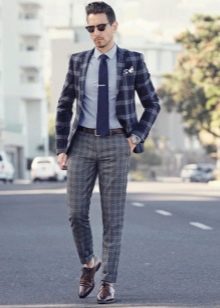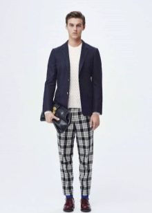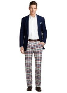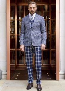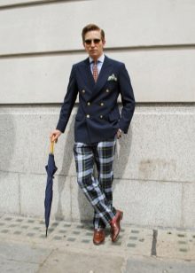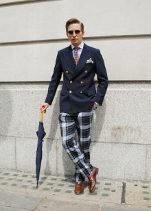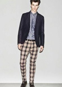 يبدو القفص مثيرًا للإعجاب للغاية ، ويتكون من خطوط من عدة ظلال من اللون الأزرق ، بينما تتناوب الخطوط الأضيق والأعرض عادةً. هذه البنطلونات هي نعمة حقيقية لقوس الأعمال ، خاصةً إذا كانت أضيق في الأسفل. إنها تشكل ترادفًا أنيقًا مع السترات الواقية من الرصاص والصدريات والقمصان العادية.