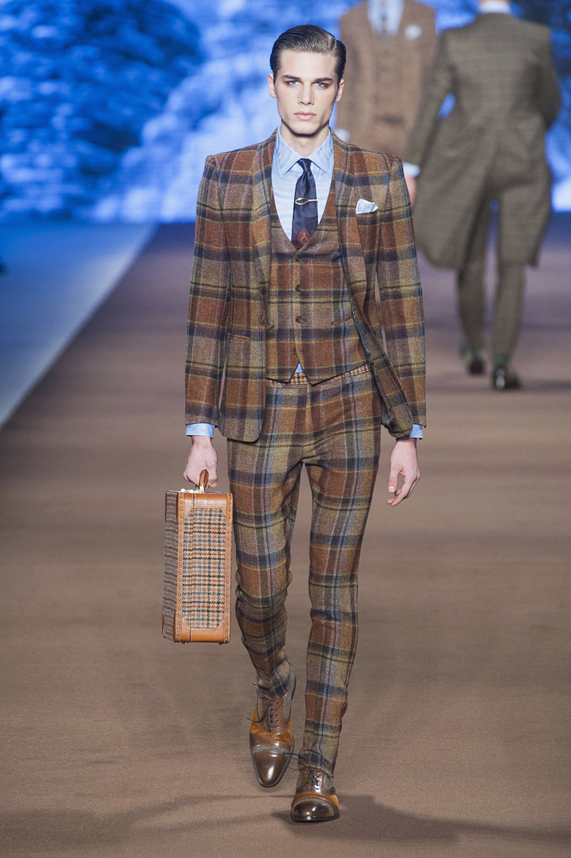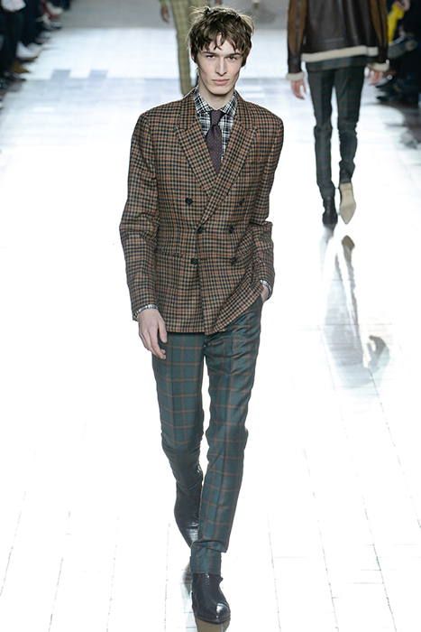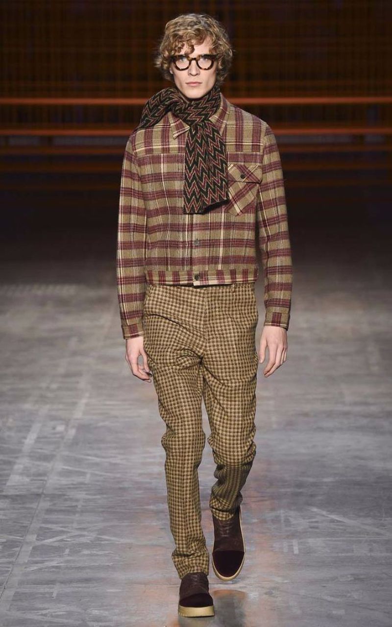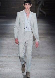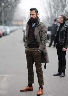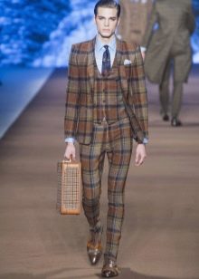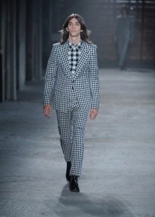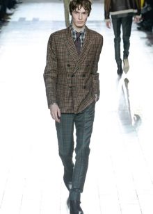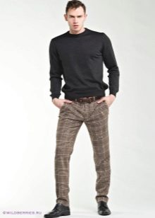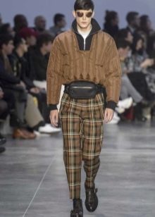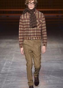 النماذج ذات الشيك البني عادة ما تكون رجعية. المصممون معجبون بمجموعات البيج والبني ، فهم يبدون رائعين بشكل خاص على القماش المحكم. يكتمل هذا البنطلون بسترة مطابقة ، ويبدو الطقم متناغمًا لعشاق الأسلوب غير الرسمي.