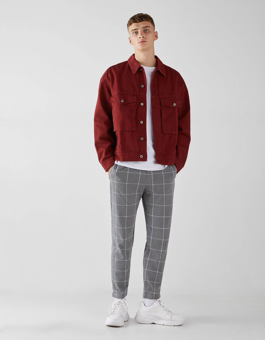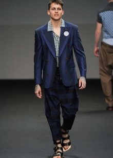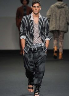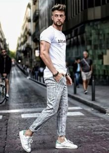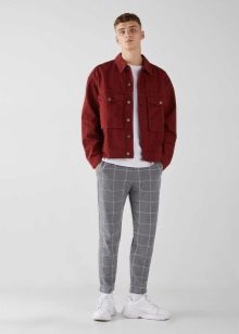 - تضييق. النمط هو الأكثر شعبية ، بينما يمكن تمثيل النمط من خلال مجموعة متنوعة من الطرز: المؤخرات ، السراويل الضيقة للشباب أو السراويل العسكرية الوحشية. بالنسبة للشباب ذوي الشكل المناسب ، يمكننا أن نوصي بنموذج ضيق بقفص صغير ، ولا يُسمح بالنموذج الكبير إلا عندما يكون هناك نقص في كتلة العضلات ووزنها. القفص المختار بشكل صحيح يضبط الصورة الظلية ويحسن النسب. ومع ذلك ، يجب على الرجال "في الجسم" الامتناع عن المطبوعات الكبيرة والألوان الغنية.