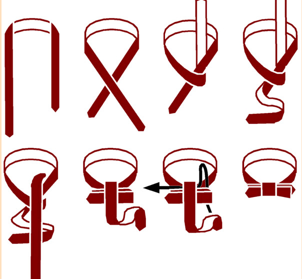 ينتمي هذا النوع من المواقع إلى الفئة غير الرسمية. من المثير للاهتمام أن نلاحظ حقيقة ذلك اخترعته امرأة. لإنشائه ، يجب وضع الحافة العريضة أعلى الحافة الضيقة (يجب أن يتم ذلك في الاتجاه إلى اليسار). ثم نلف الطرف العريض حول الطرف الضيق ونشكل جيبًا ، ثم نلف الشريط العريض فوق الحلقة. بعد ذلك ، تحتاج إلى ترتيب محيط الحلقة وإخراج شريط عريض على الجانب الأيمن. يجب تكرار الدوران حول الجزء الضيق مرة أخرى ، مع إنشاء جيب آخر. بعد ذلك ، تحتاج إلى إحضار الشريط في الحلقة وخيط الحافة العريضة لأعلى.