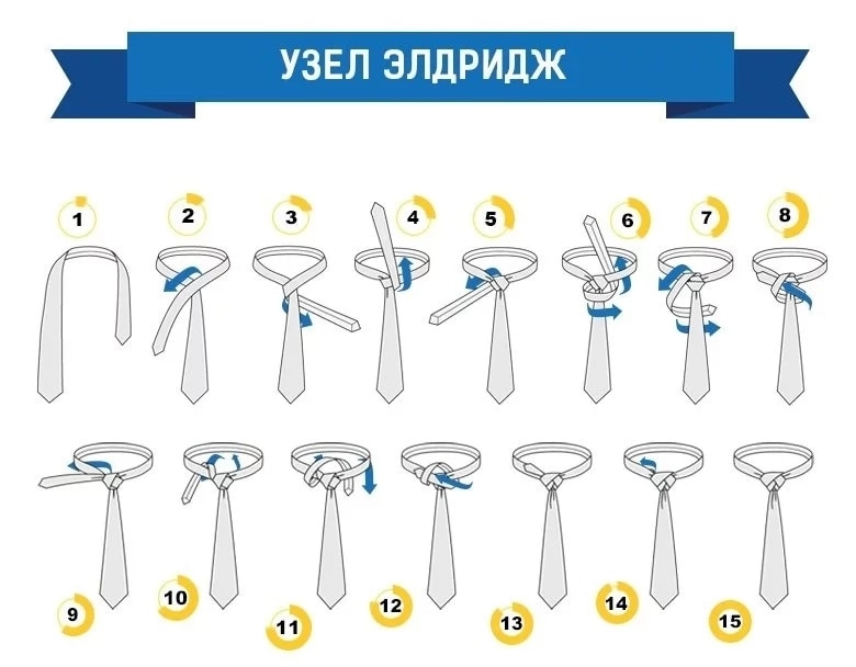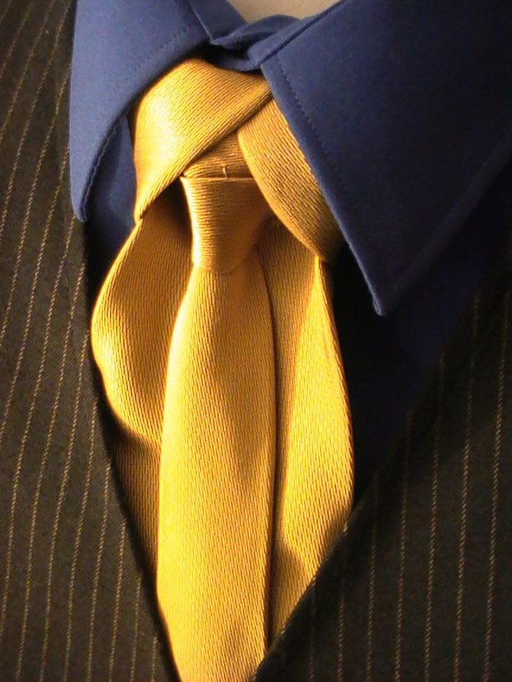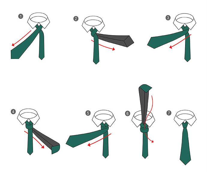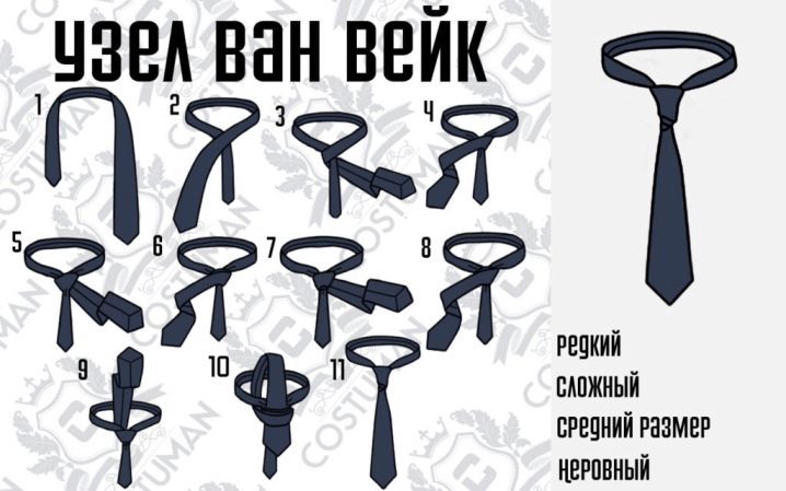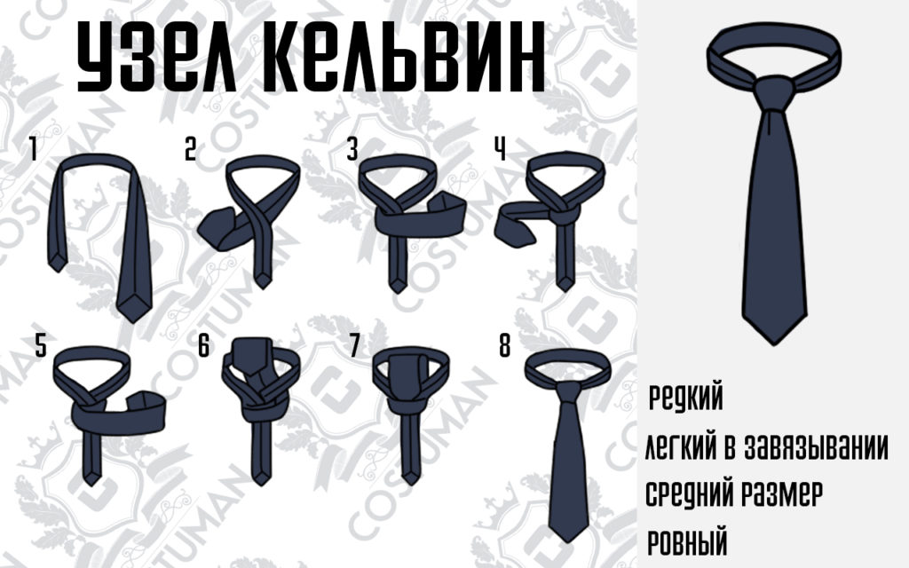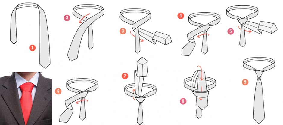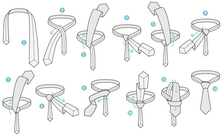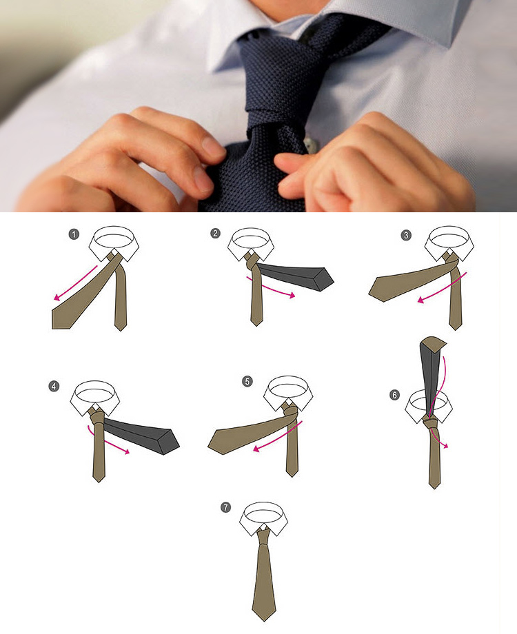 يجب أن يكون هذا الخيار مفضلًا إذا إذا كان طوق القميص الخاص بك يحتوي على زر أو برشام. في كثير من الأحيان يتم اختيار هذه العقدة إذا كانوا يريدون إنشاء صورة غير عادية وحيوية. لنسجها ، يجب أن تكون النهاية العريضة للربطة محاطة بدائرة ثلاث مرات حول النحافة - بهذه الطريقة ستنشئ طيات جميلة.