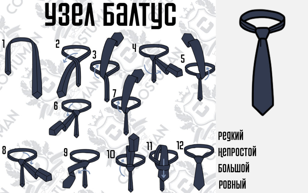 هذه العقدة كبيرة جدًا. على التوالى، لن تعمل مع كل زي. في شكله "بالثوس" يشبه المخروط. لكي تخرج العقدة بنجاح ، يوصى باختيار ربطة عنق ذات نهايات طويلة. العقدة مثالية للممثلين المنخفضين للنصف القوي للبشرية. لإنشائه ، يجب أن تكون النهاية الضيقة قصيرة.