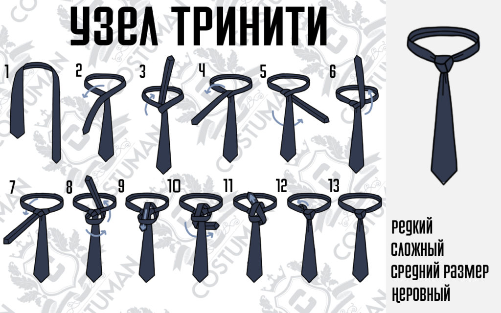 هذه العقدة أصلية تمامًا ، حيث تشبه في شكلها علامة وثنية. يوصى بربط "الثالوث" عن طريق الطرف الضيق للربطة. أرجو أن تعلم أنه العقدة صعبة التنفيذ وقد لا تعمل في المرة الأولى.