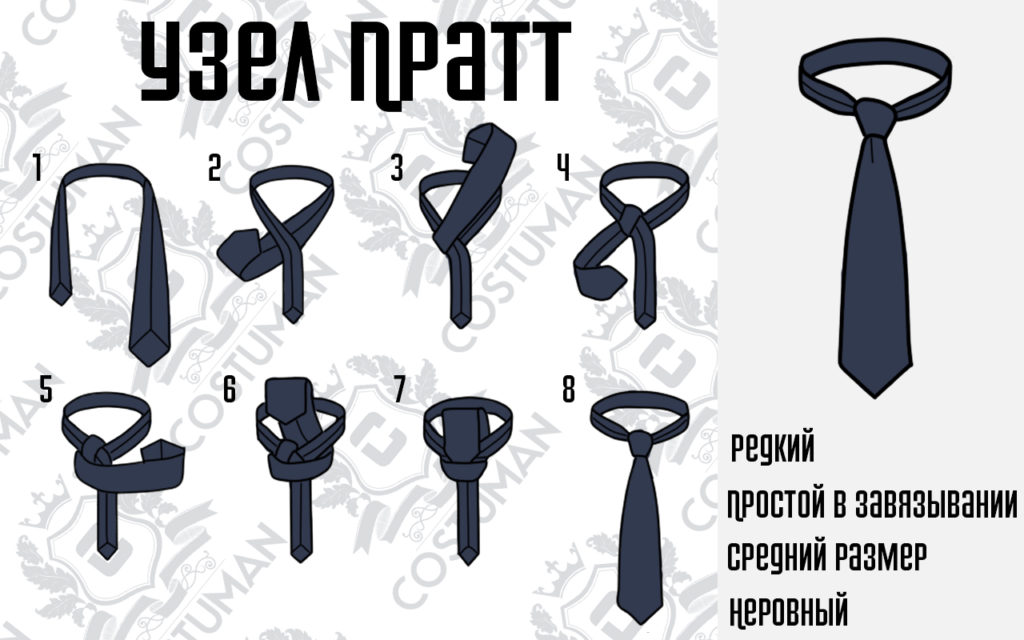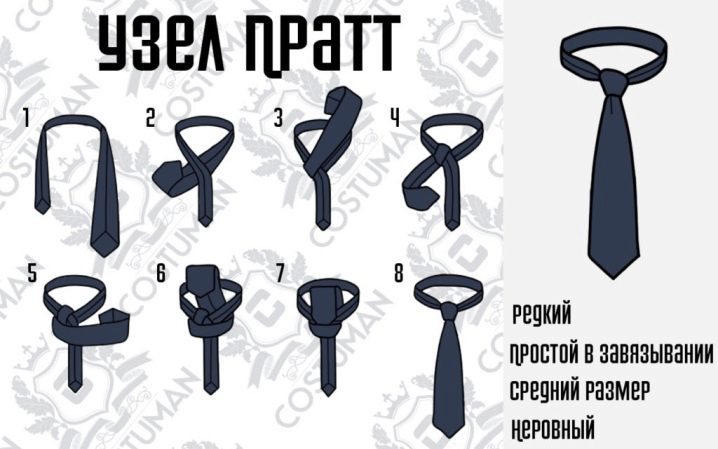 إذا اخترت هذه العقدة ، فأنت بحاجة إلى ربط الجانب السيئ من ربطة العنق بالخارج. وفقًا لخصائصه ، تبين أن "Pratt" ضخمة جدًا غالبًا ما يتم استخدامه للرباطات القصيرة جنبًا إلى جنب مع طوق القميص الضيق.