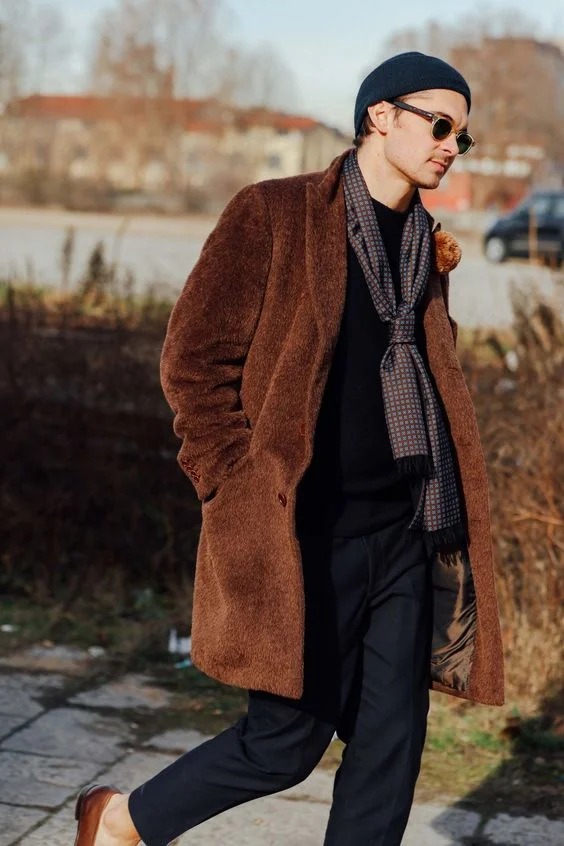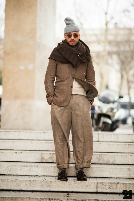 - معطف أنيق من صوف الجمل ، وقميص أبيض بحروف متناقضة ، وكاتم صوت فاتح داكن يتدفق بحرية في مهب الريح ، وقبعة صغيرة خضراء زيتونية ستصبح أساسًا لتشكيل صورة مدني واثق من نفسه.