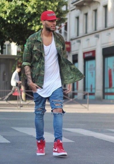 - القوس الوحشي وزارة الدفاع الحضرية. الغطاء الأحمر يكمله حذاء مطابق. هم أساس الصورة ، وأبرز تفاصيلها. تم اختيار الجينز الممزق الأنيق وقميص أبيض ممدود وفقًا للأسلوب. يكمل هذا المظهر قميصًا كاكيًا مموهًا بأكمام مطوية.