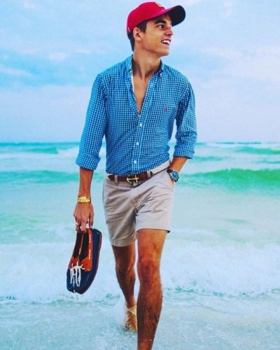 - تجهيزات رائعة لقضاء عطلة. قميص قطني بأكمام 3/4 ، شورت بيج من الكتان فوق الركبتين وحذاء موكاسين باللونين الأحمر والأزرق مع أربطة بيضاء - هذا المزيج مناسب على الشاطئ وفي نزهة في المنتجع. تعكس قبعة البيسبول الحمراء صدى لون الحذاء ، مما يعطي ميزة لونية مفيدة للمظهر بالكامل.