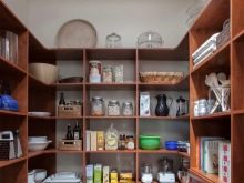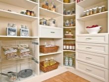 - دائمًا ما يكون الخيار حيث يوجد على الأقل عدد قليل من الأرفف المغلقة والأدراج القابلة للسحب أكثر ملاءمة... هذا يحمي الأشياء من السقوط العرضي ، لأن حجرة المؤن ضيقة ، وأثناء بحث الشخص عن شيء ما ، قد يلمس شيئًا آخر دون قصد. مع الرف المغلق والأدراج القابلة للطي ، يتم تصغير هذه الحالات.