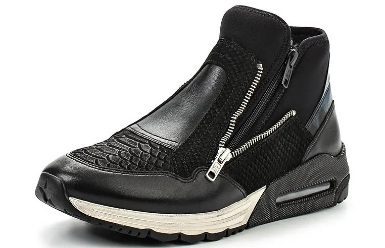 خيار رائع لمن يفضلونه أحذية رياضية مصنوعة من مواد طبيعية. يمكن ارتداء أحذية رياضية متوسطة الارتفاع في الخريف وكذلك أوائل الربيع. تم استكمال النموذج باللون الأسود بخطوط فضية على الكعب.