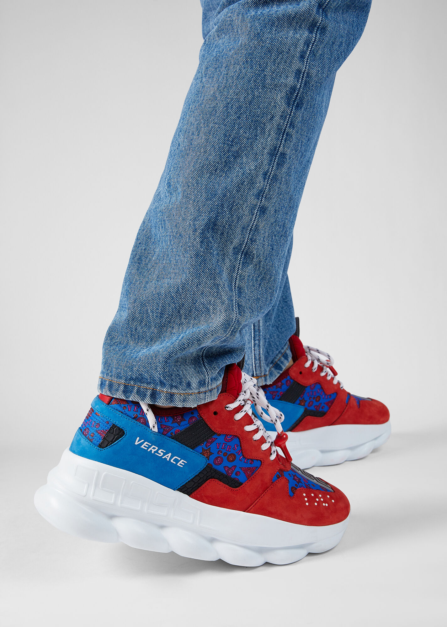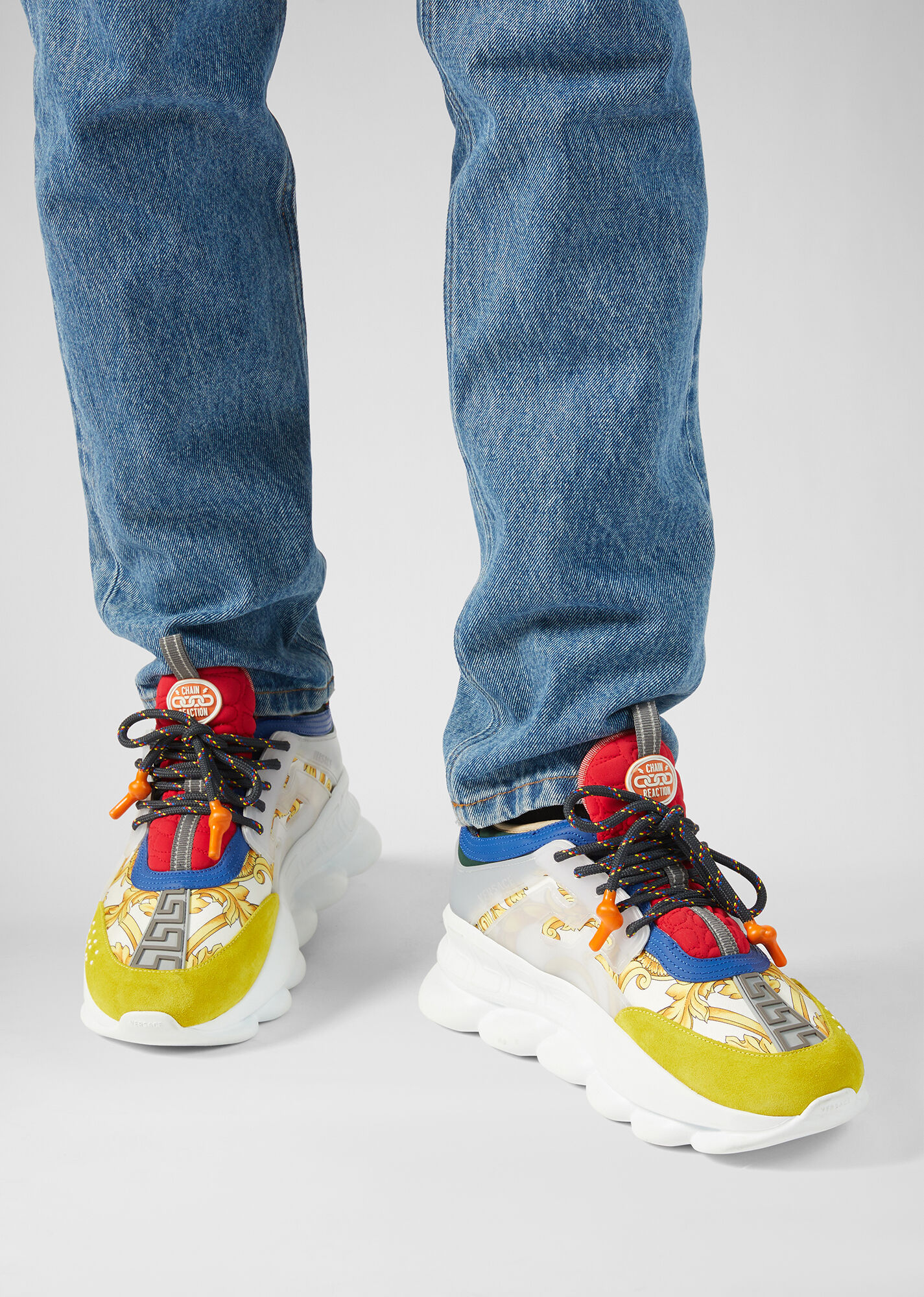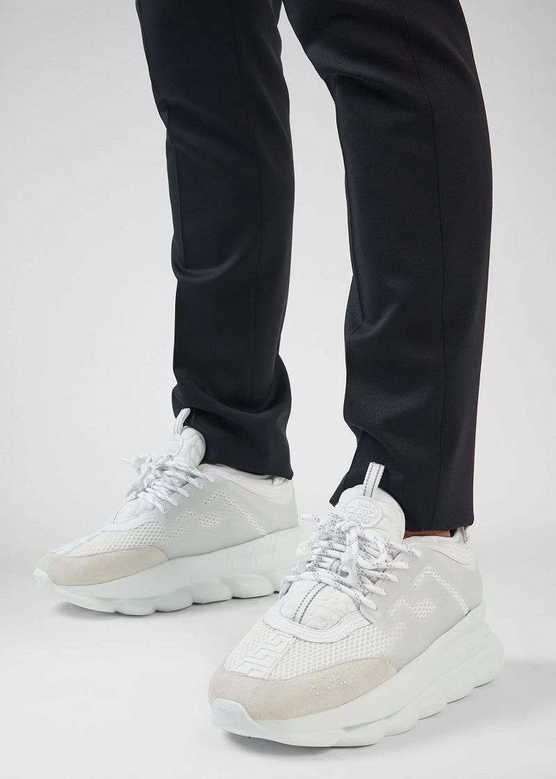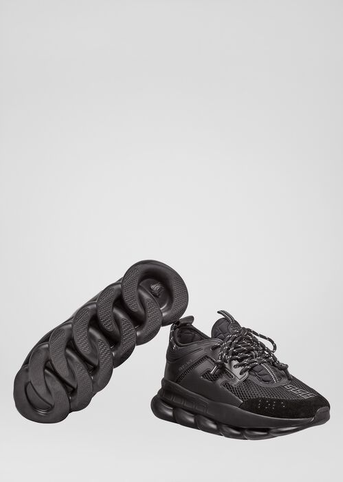 نموذج التفاعل المتسلسل بألوان مختلفة مصنوع من جلد العجل والشبكة و nubuck. يتميز النعل بنمط سلسلة مستوحى من مجوهرات فيرساتشي. في الوسط ، يكتمل النموذج برسم Greca وبرايل وشعار Chain Reaction على اللسان.