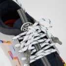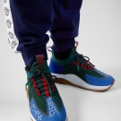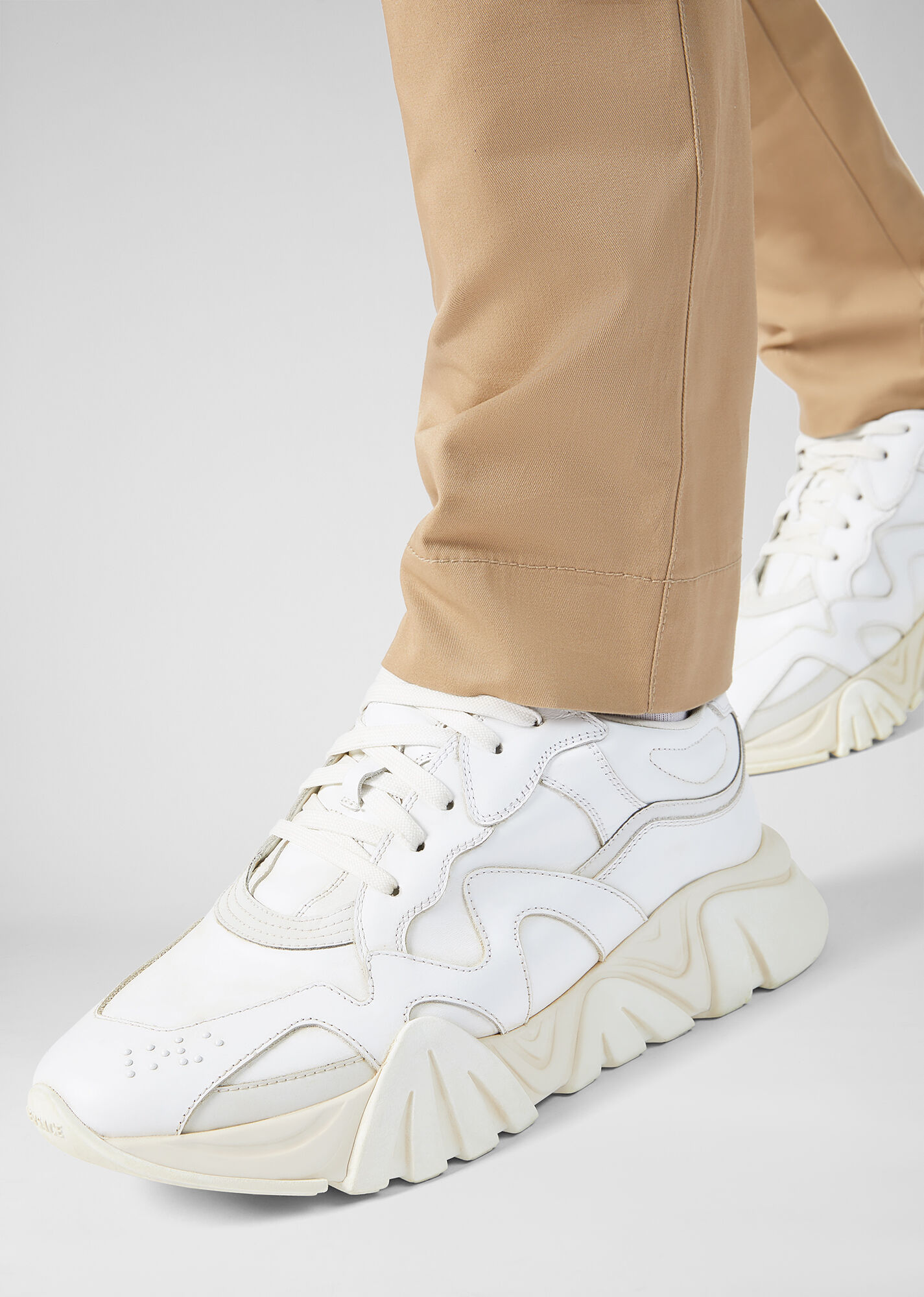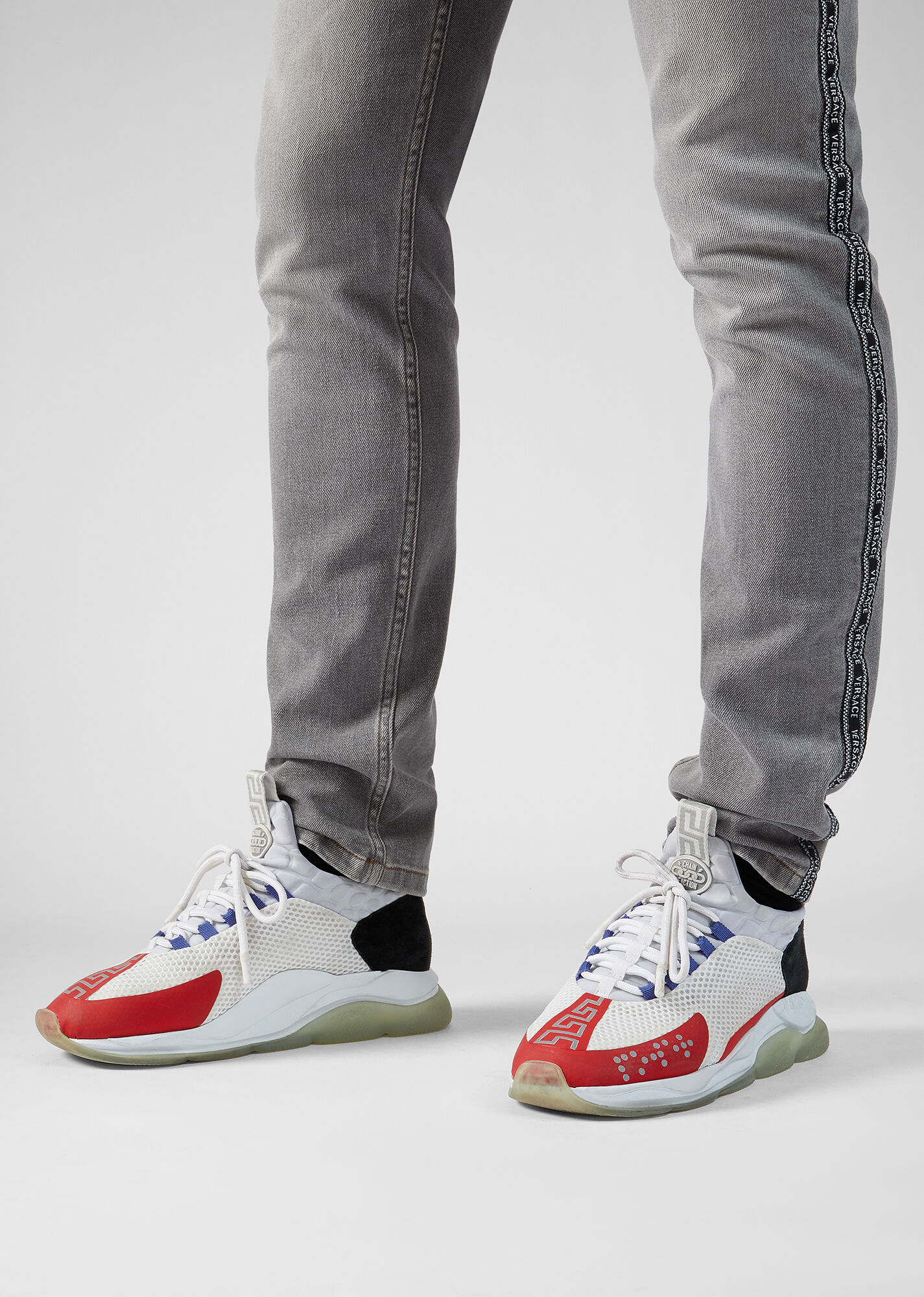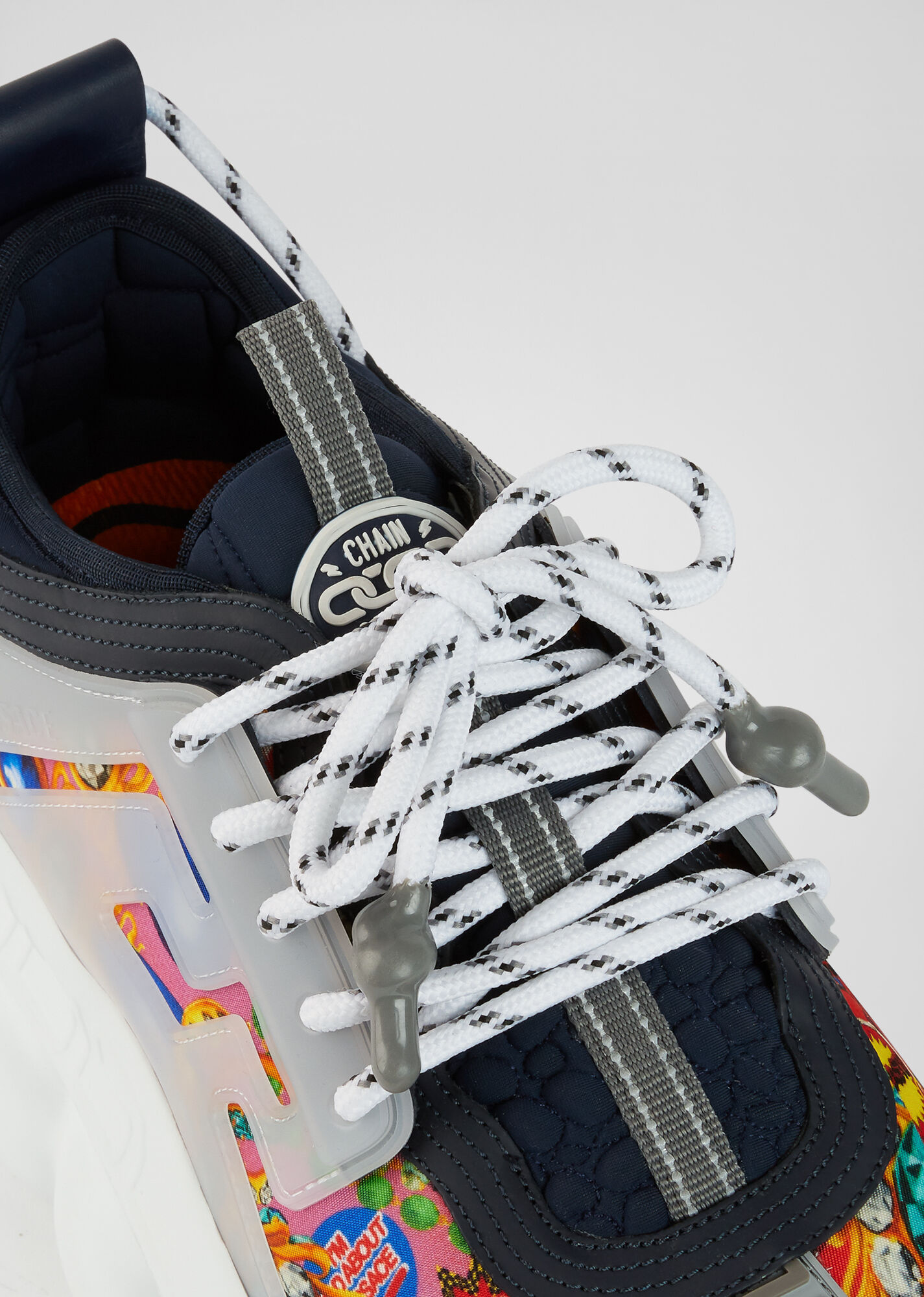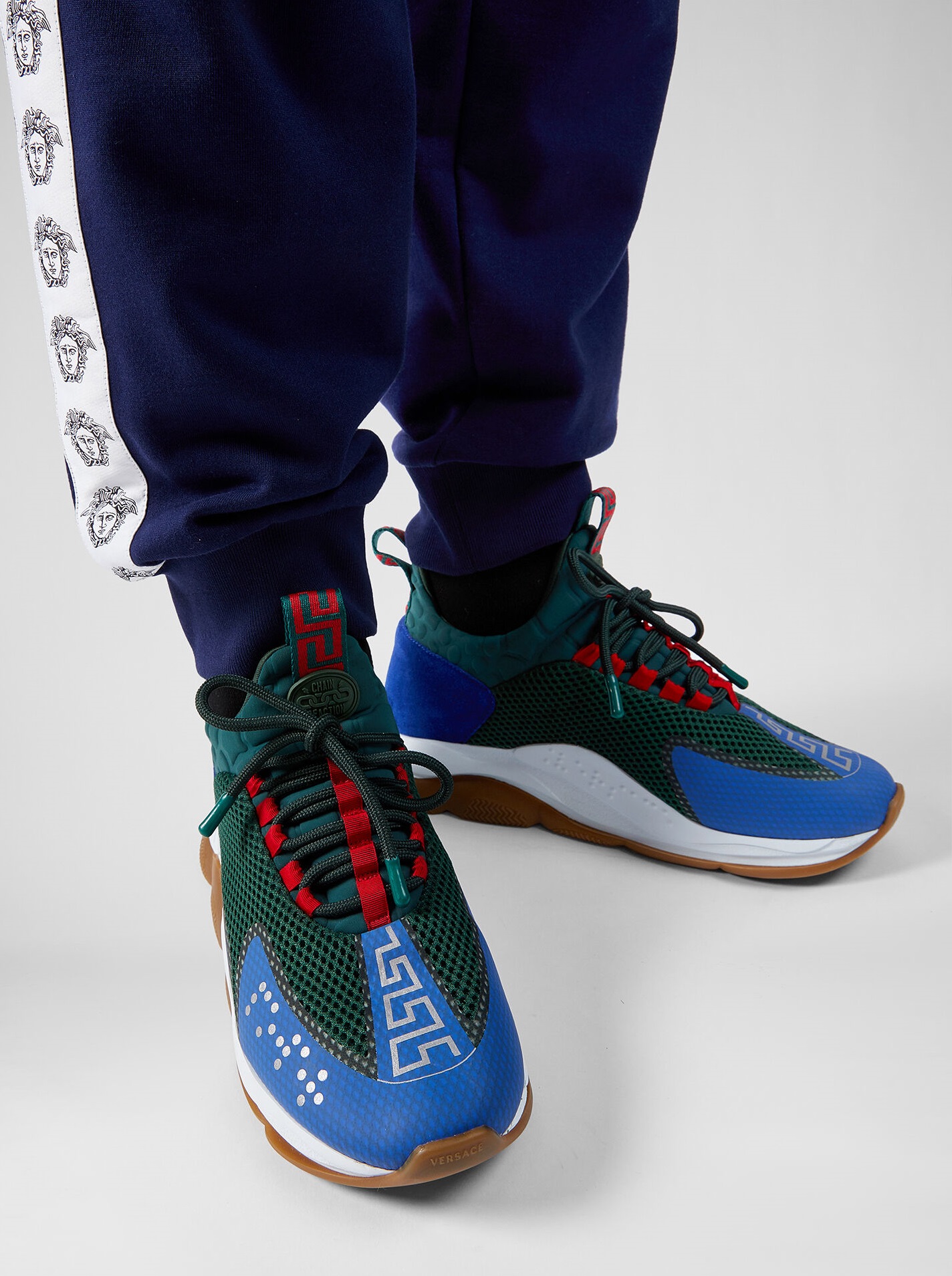 نموذج التفاعل المتسلسل بألوان مختلفة مصنوع من جلد العجل والشبكة و nubuck. يتميز النعل بنمط سلسلة مستوحى من مجوهرات فيرساتشي. في الوسط ، يكتمل النموذج برسم Greca وبرايل وشعار Chain Reaction على اللسان.