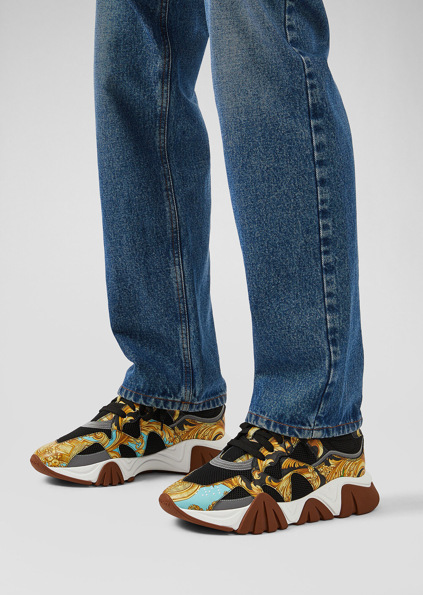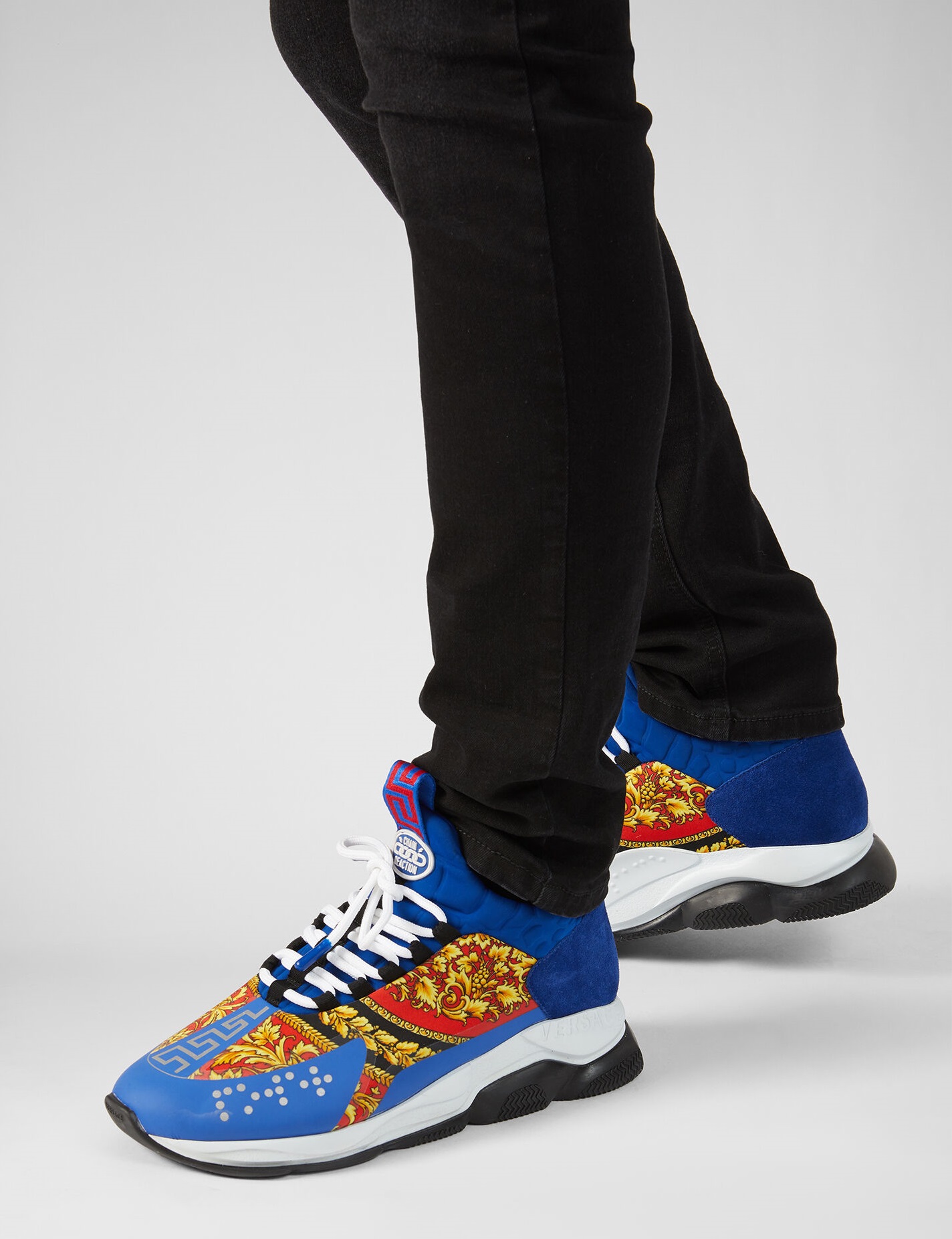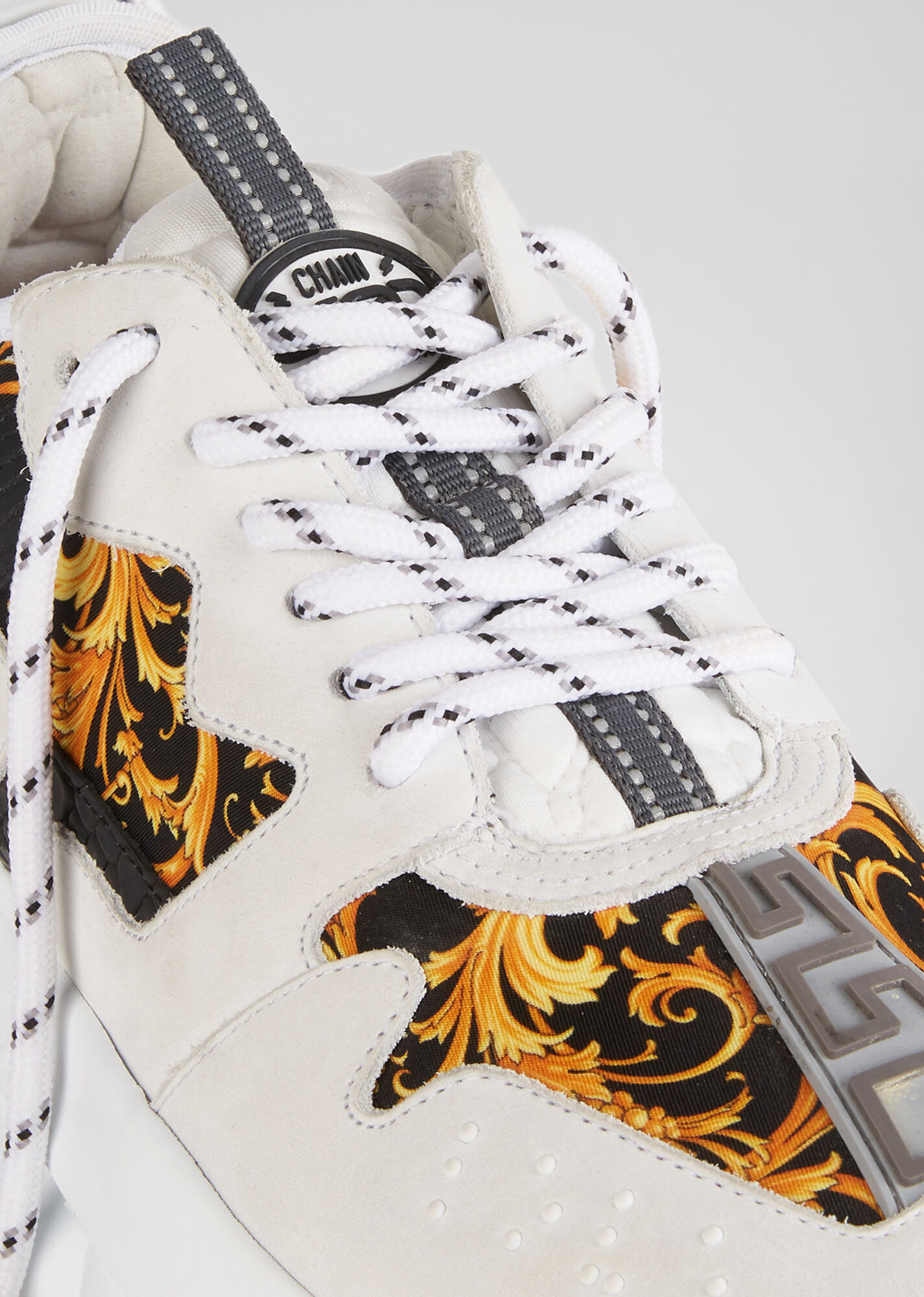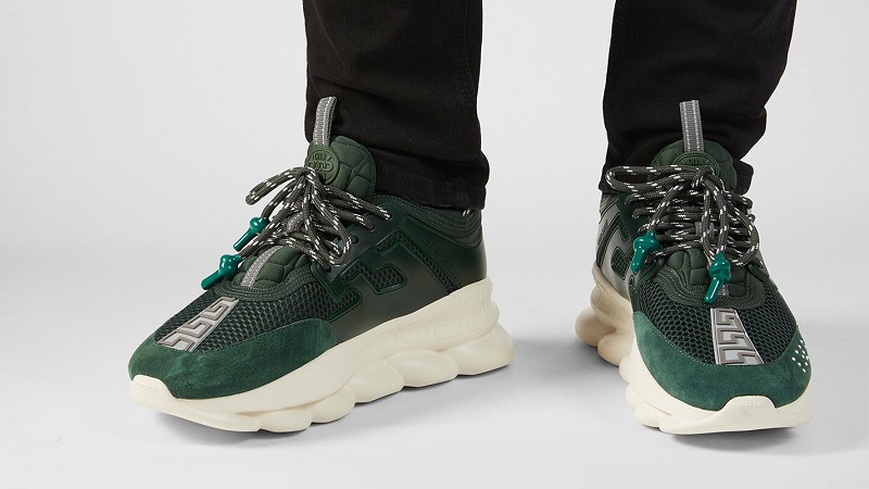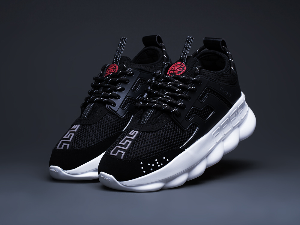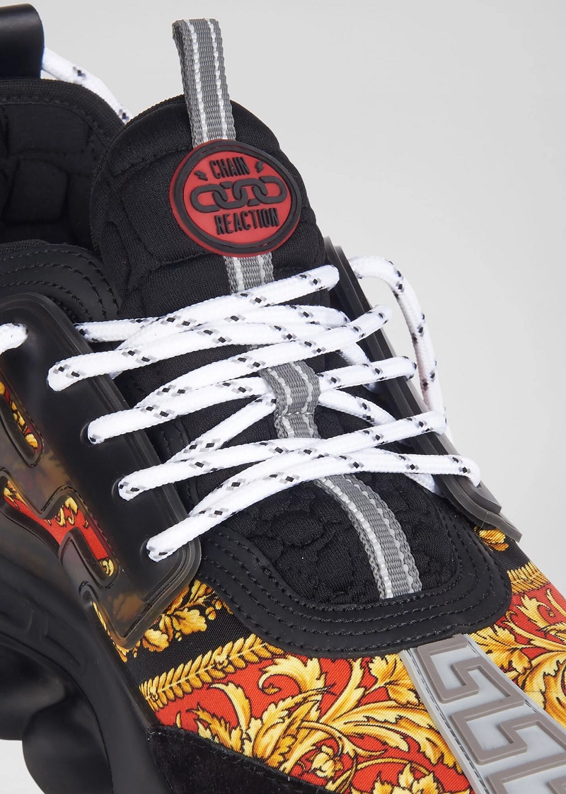 إنه مثال لأسلوب فيرساتشي الذي لا تخطئه العين. خلقت مجموعة منتقاة من التفاصيل حذاءً فريدًا بنعل مطاطي خفيف الوزن. تشمل السمات المميزة لهذا النموذج ملصق شعار Chain Reaction وحروف الحب والديكور المتعرج.