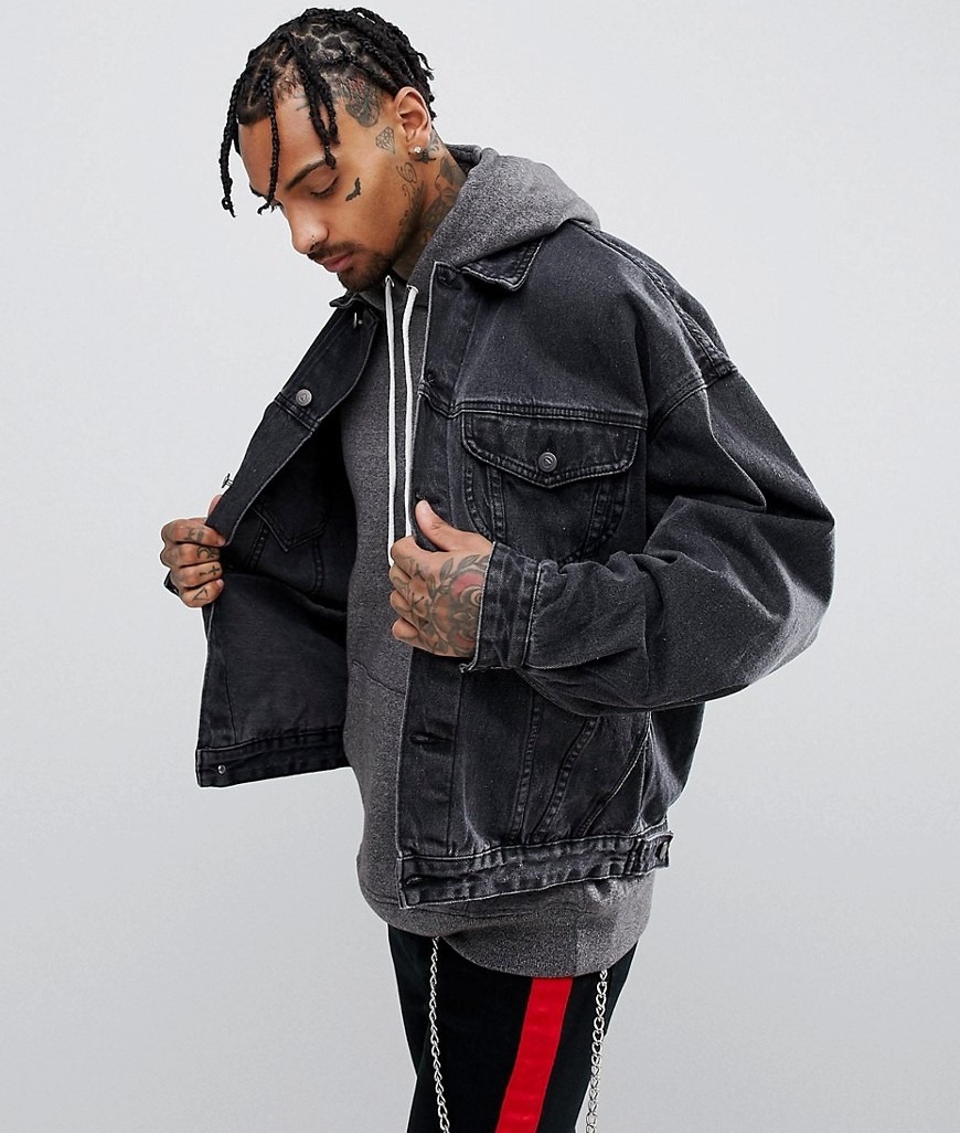 - هودي من الصوف وسترة جينز سوداء كبيرة الحجم.