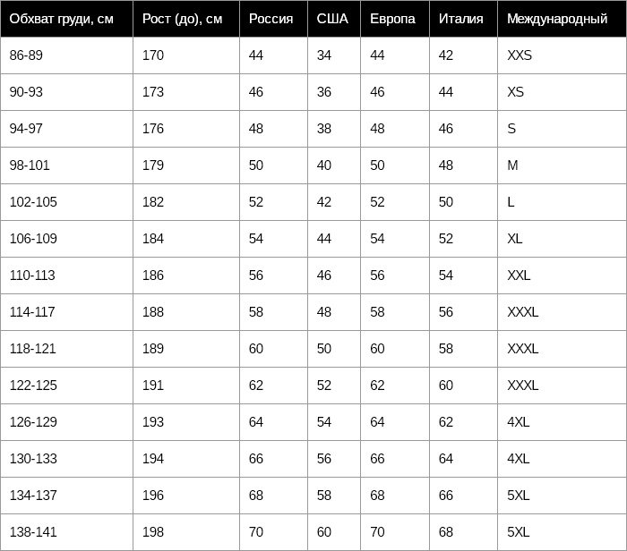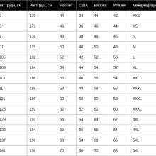 بفضل الجدول الخاص حيث تتم الإشارة إلى المعلمات ، يمكنك تحديد الحجم المناسب لملابس الرجال بسرعة. باستخدامه ، يكفي ببساطة مقارنة نتائج قياساتك بالعلامات المطلوبة. يمكنك أيضًا معرفة حجم المنتجات ليس فقط من روسيا ، ولكن أيضًا من الإنتاج الأجنبي.