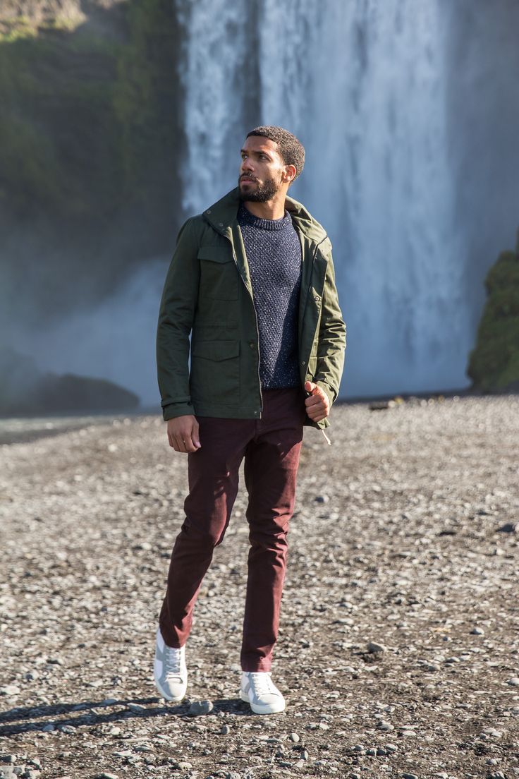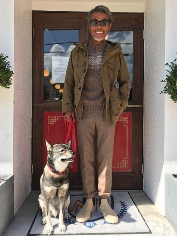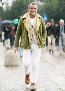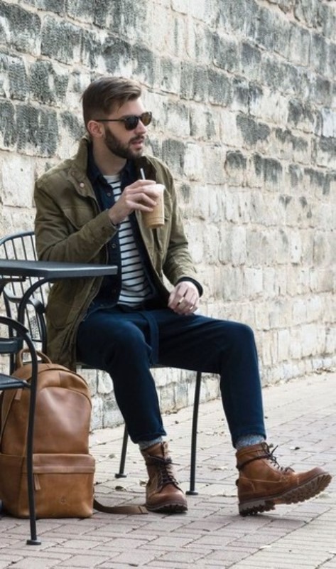 يرتدي البنطلون والأحذية الجلدية البنيّة الأصلية زوجًا جيدًا مع سترة كبيرة الحجم على طراز همنغواي وسترة كاكي خضراء شاحبة. في الطقس الدافئ ، يمكنك ارتداء الياقة المدورة الرقيقة من النبيذ أو اللون الرمادي والأزرق.