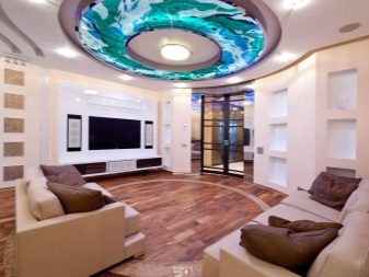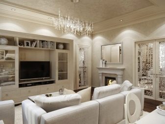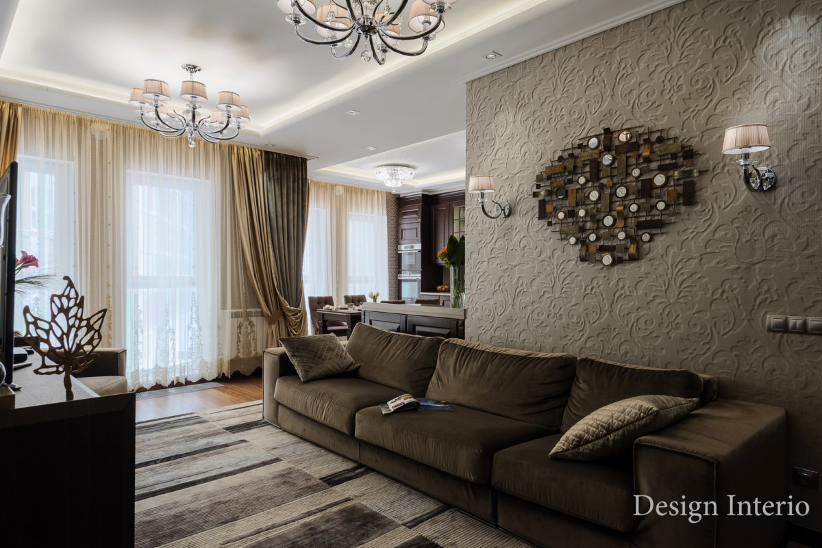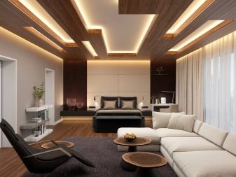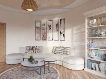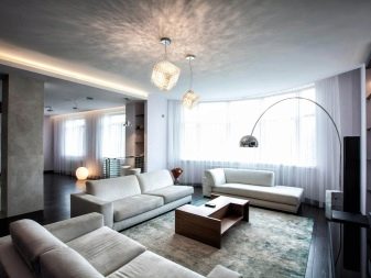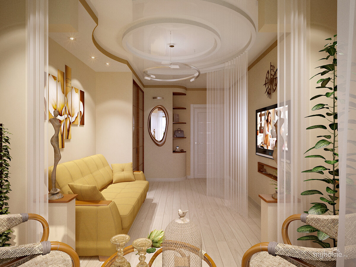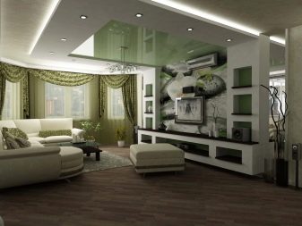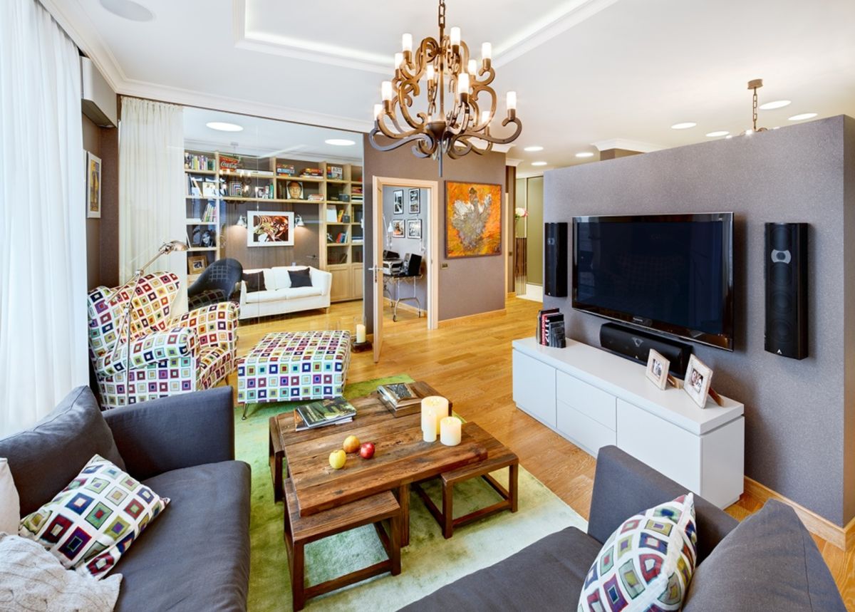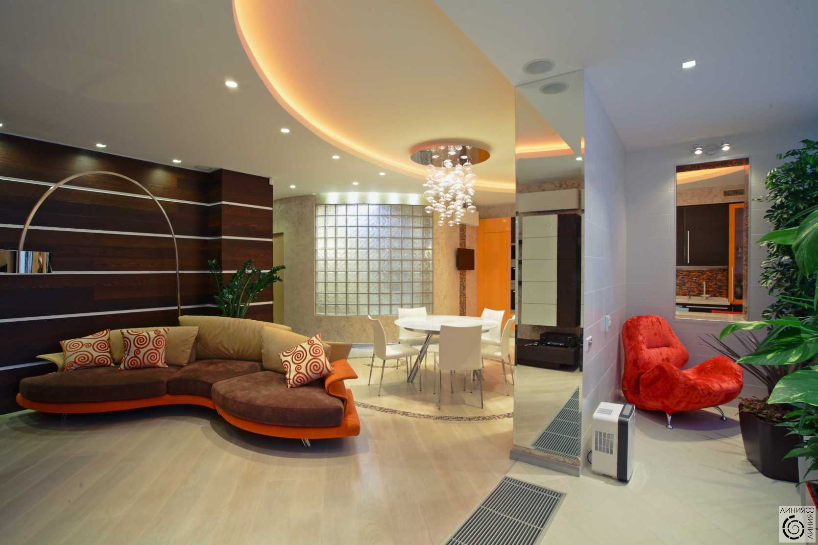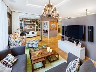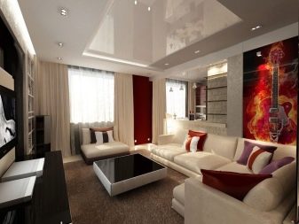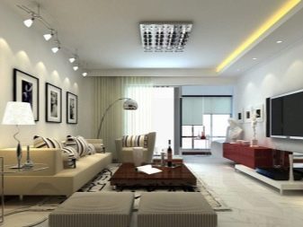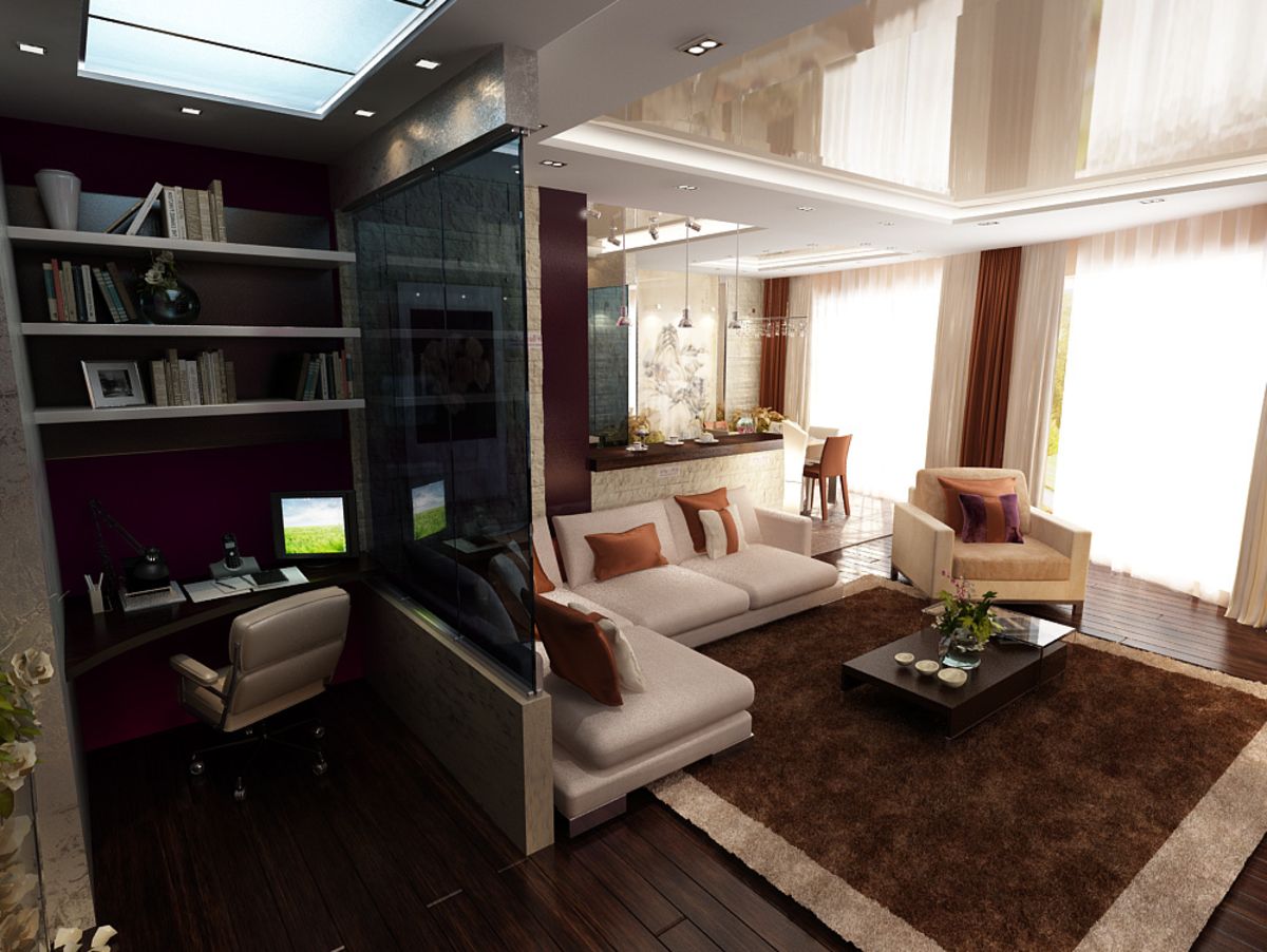 - مثال على تصميم غرفة معيشة طويلة ممدودة في شقة من أربع غرف. هذا المقطع ، على الأرجح ، الغرفة مقسمة إلى منطقة وسائط ومنطقة مكتبة ، ويتم التقسيم بهدوء شديد ، ولكن بشكل صريح.