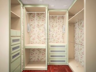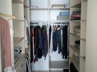 يمكن أن تكون غرفة ارتداء الملابس على شكل حرف U عبارة عن هيكل واسع جدًا ، إذا كنت تخطط بشكل صحيح لمكان ونوع الأثاث الذي سيكون موجودًا فيه. في أغلب الأحيان ، لمثل هذا التصميم ، يتم استخدام سماعات رأس متجانسة مع أقسام وخزائن جاهزة ، بالطبع ، يتم تعديلها حسب حجم الغرفة.