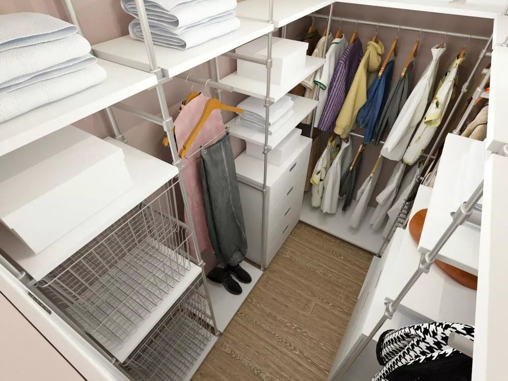 في الجزء السفلي من خزانة الملابس ، من المهم جدًا وضع أرفف خاصة لتخزين الأحذية والإكسسوارات ذات الصلة.