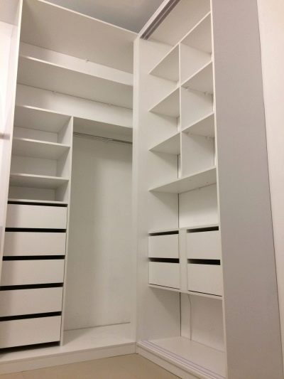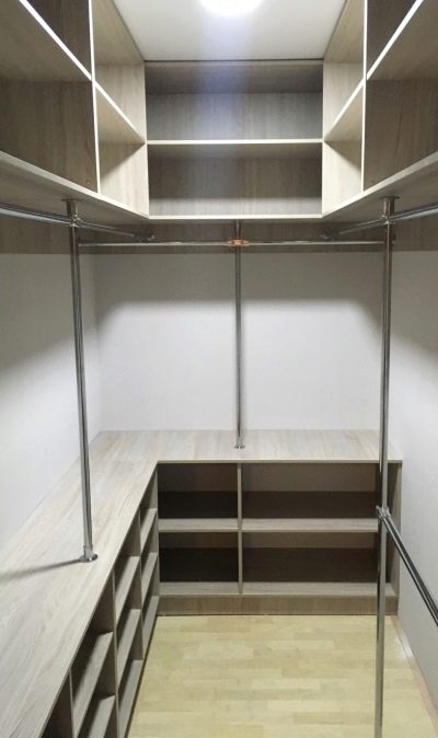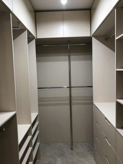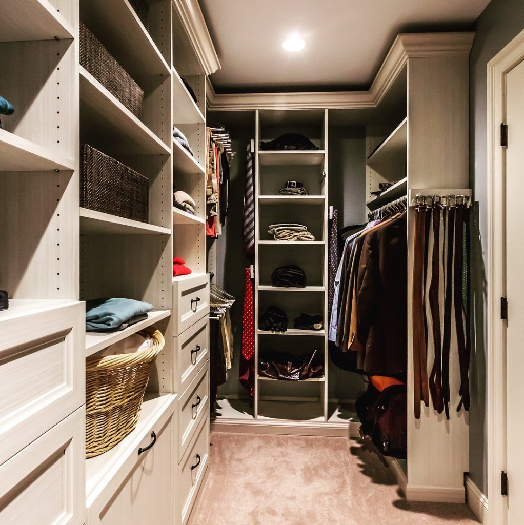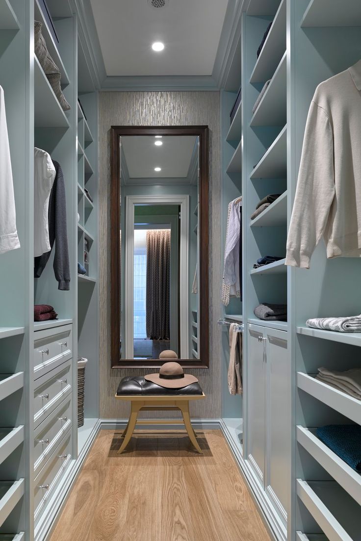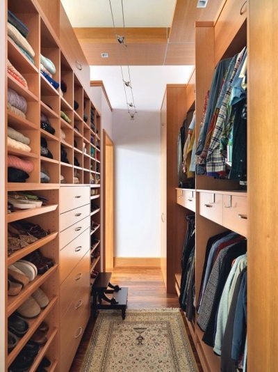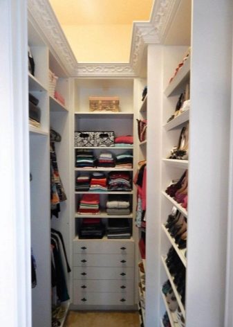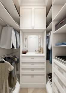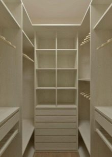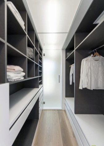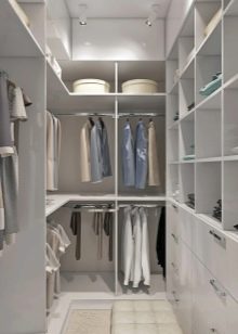 تصميم على شكل حرف U مناسب للغرف الأكثر اتساعًا. غالبًا ما تكون هذه غرفة منفصلة أو غرفة تخزين سابقة ضيقة ولكنها أكثر اتساعًا. توجد أنظمة التخزين على جانبين متقابلين. على سبيل المثال ، يوجد على جانب واحد من غرفة الملابس قضبان وأرفف للملابس ، وعلى الجانب الآخر - أرفف لتخزين أغطية السرير والأدوات المنزلية الأخرى.