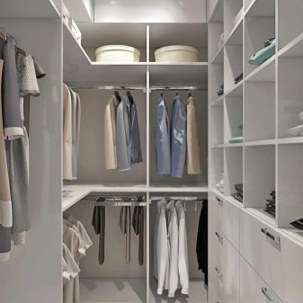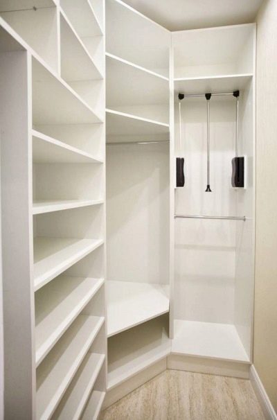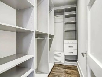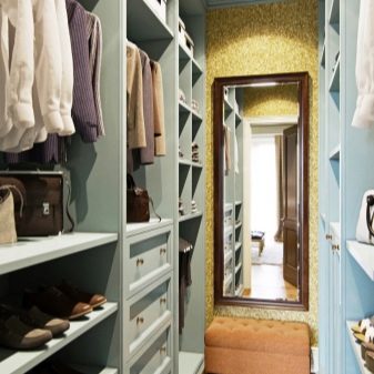 بالنسبة لمعدات خزانة الملابس ، غالبًا ما يتم تصنيع أنظمة التخزين حسب الطلب. لا يأخذ في الاعتبار حجم الغرفة والتخطيط فحسب ، بل يأخذ في الاعتبار الرغبات الشخصية للمقيمين. على سبيل المثال، يمكن جعل الأرفف العلوية كبيرة لتخزين الملابس والأحذية الموسمية في الهواء الطلق ، حيث تقل احتمالية إخراجها من الأرفف اليومية. أو بدلاً من قضيب تعليق واحد ، قد تحتاج إلى اثنين أو ثلاثة.