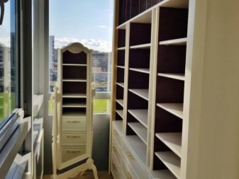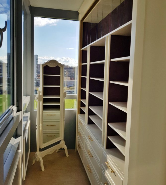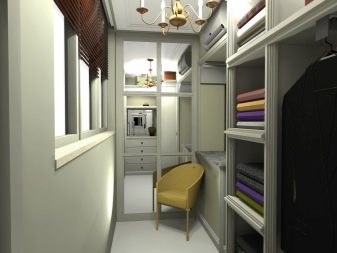 خيار رائع للشقق الصغيرة هو ترتيب غرفة تبديل الملابس على الشرفة. نادرًا ما يتم استخدام هذه الغرفة ، لذا يمكنك التغلب عليها بنجاح. في هذه الحالة ، من المهم مراعاة وجود ضوء الشمس المباشر الذي يحترق النسيج تحته. لهذا الغرض ، يتم استخدام أنظمة التخزين المغلقة ، والتي تحمي بشكل إضافي من الغبار ، أو غشاء مظلم للزجاج. يجب عزل الغرفة نفسها وإغلاقها حتى لا تدخل الرطوبة الناتجة عن هطول الأمطار ، ولا يتراكم التكثيف.