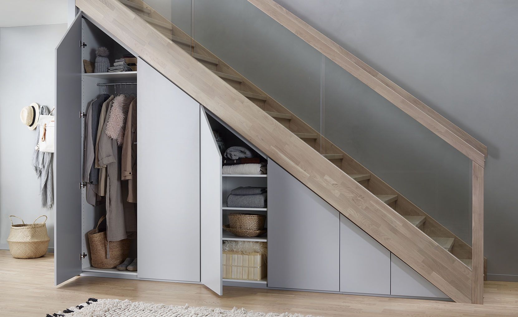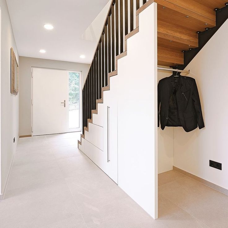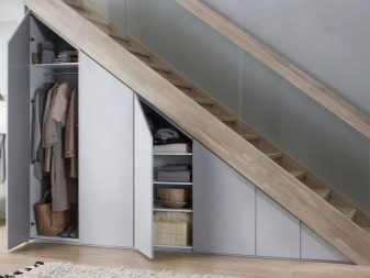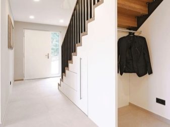 في منزل خاص من طابقين ، يمكنك إخفاء غرفة تبديل الملابس تحت الدرج. نادرًا ما يتم استخدام هذه المساحة ويمكن تجهيزها بشكل مربح.