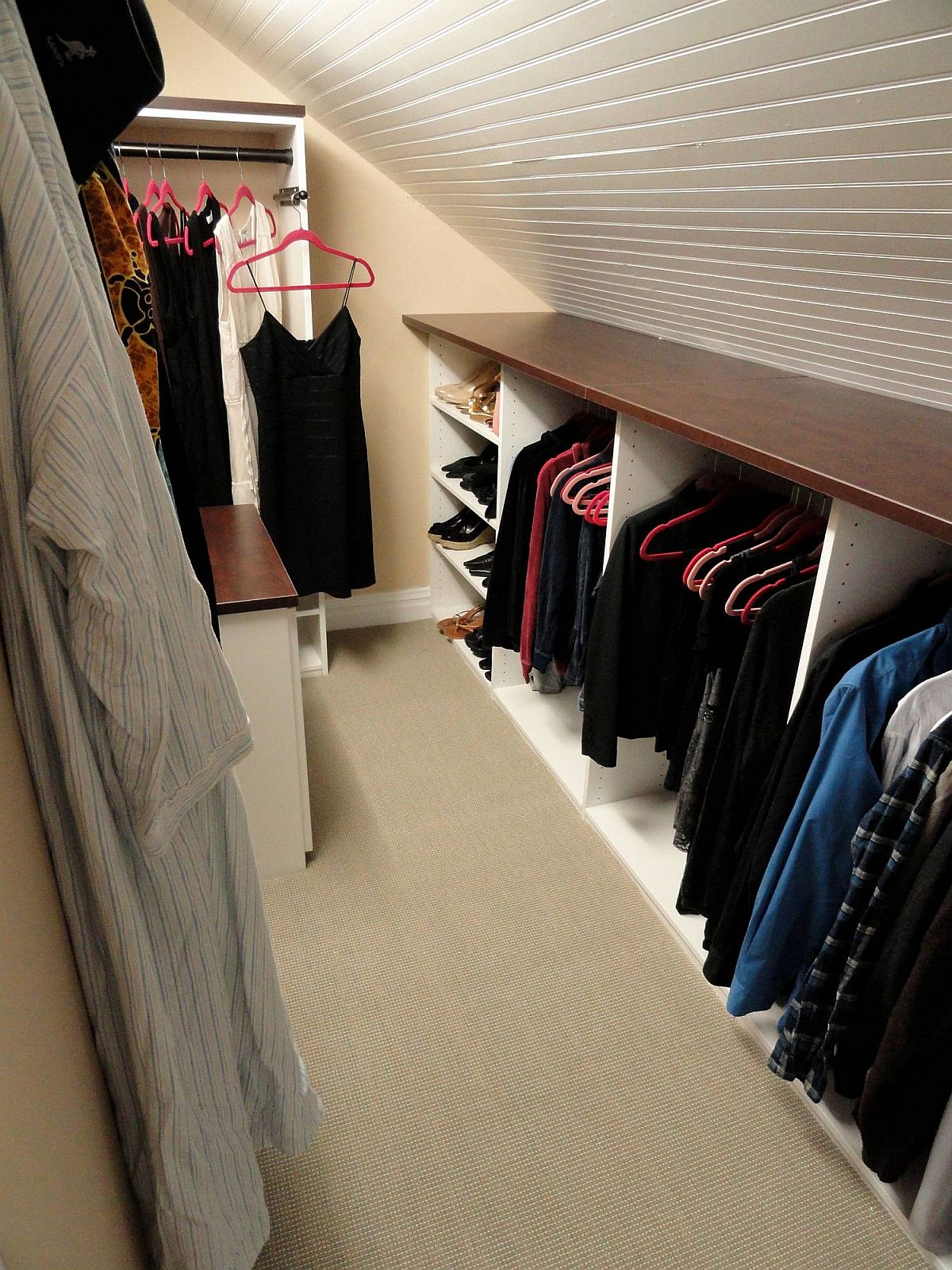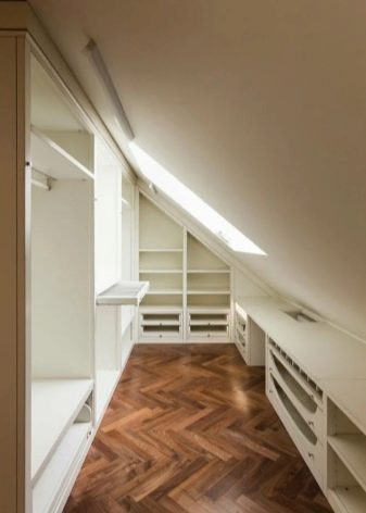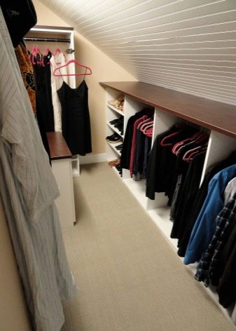 كخيار، يمكنك ترتيب غرفة خلع الملابس في العلية. غالبًا ما تحتوي الغرفة على سقف منخفض مائل في بعض الأماكن بسبب نتوءات السقف. كل هذا يحد من وظائف الغرفة. لتجهيز مثل هذه المساحة ، على الأرجح ، ستحتاج إلى شراء أثاث حسب الطلب.