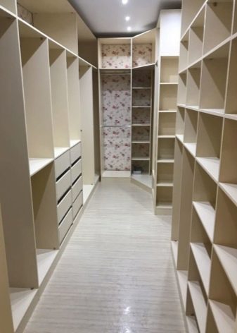 تسمح لك خزانة الملابس الكبيرة بتحرير مساحة معيشتك من الأثاث غير الضروري. يتم نقل كل ما يمكن تخزينه في الخزائن وخزائن الملابس إليه. في الوقت نفسه ، تصبح أكثر اتساعًا ليس فقط في غرفة النوم أو غرفة المعيشة ، يمكنك تفريغ قاعة المدخل والحضانة وحتى الشرفة.