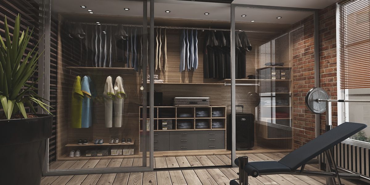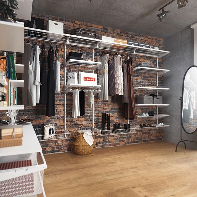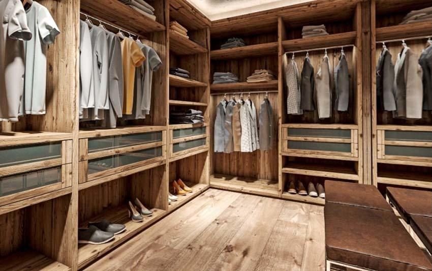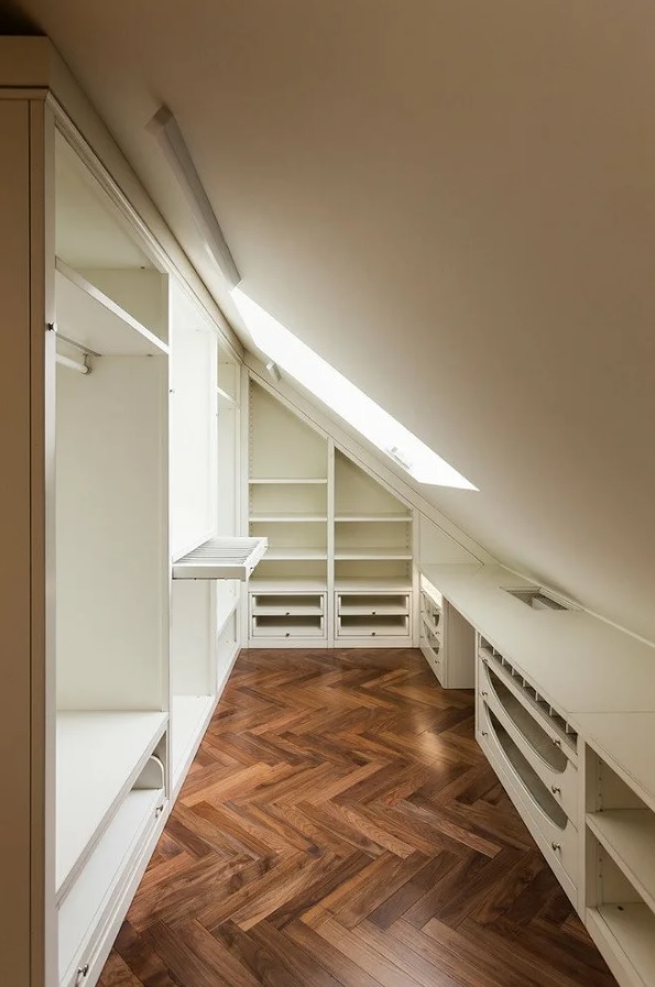 أسلوب الدور العلوي مثالي أيضًا لغرفة تبديل الملابس. يجب أن تشبه الجدران البناء بالطوب ، وأنظمة التخزين المفتوحة التي تذكرنا برفوف التخزين.