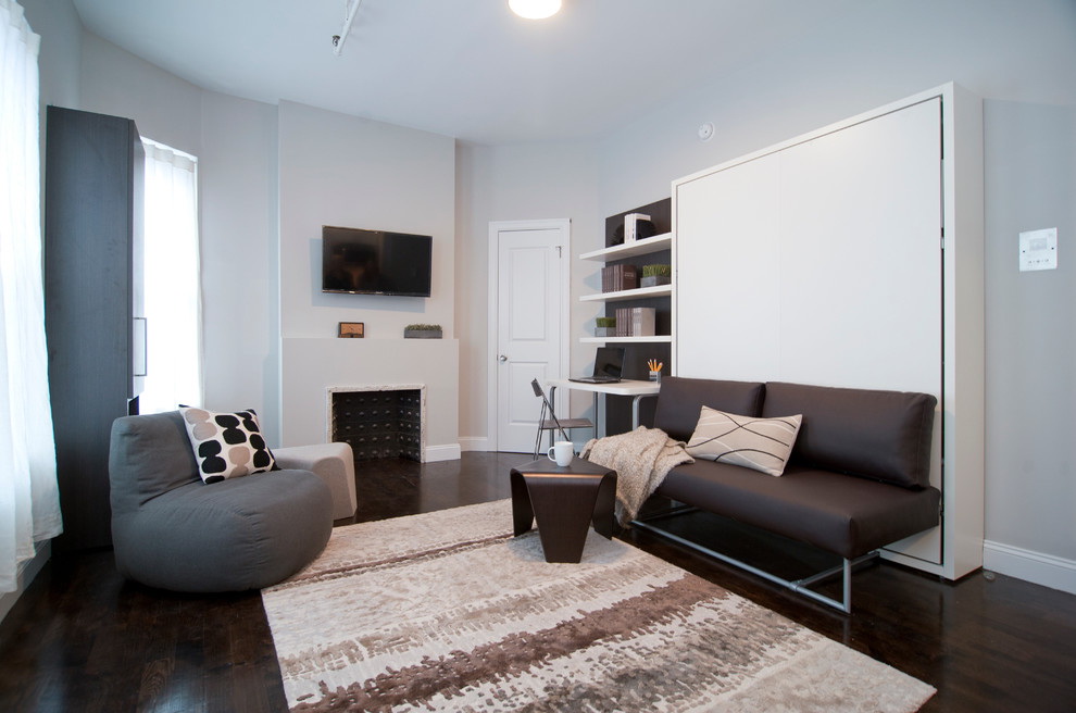بالنسبة للشقق الصغيرة المكونة من غرفة واحدة ، سيكون الأثاث المعياري هو الخيار المثالي ، والذي يشغل مساحة دنيا ، ولكن في نفس الوقت يتمتع بوظائف مذهلة.