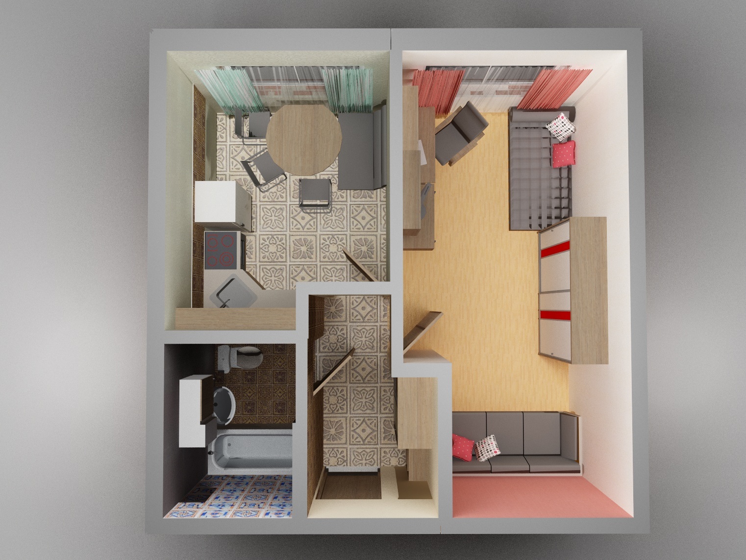 شقة من غرفة واحدة، مقسمة إلى عدة مجالات وظيفية مع قسم.