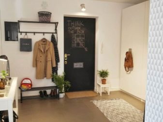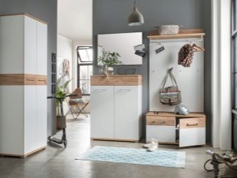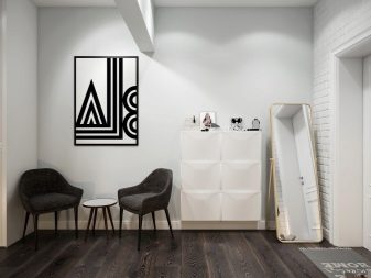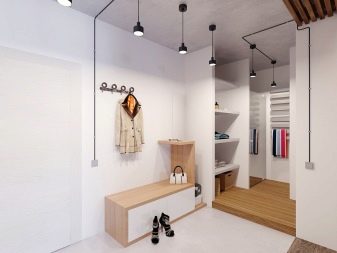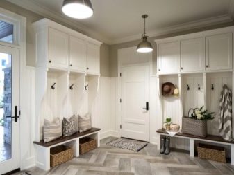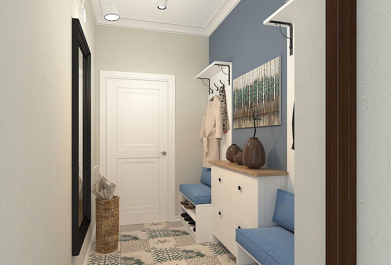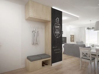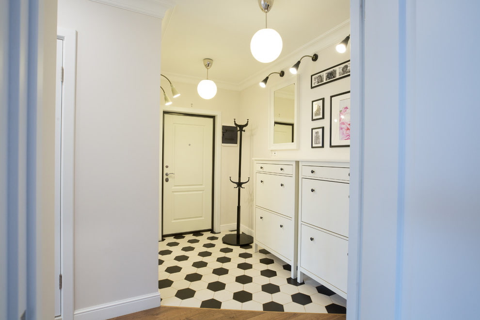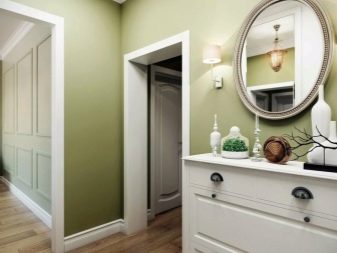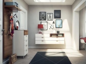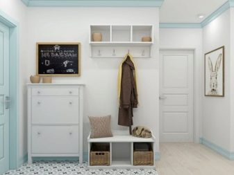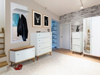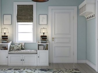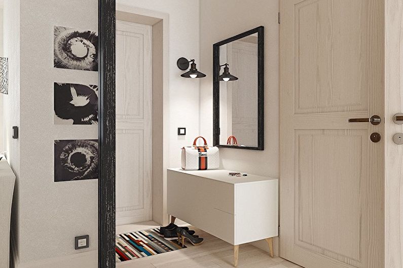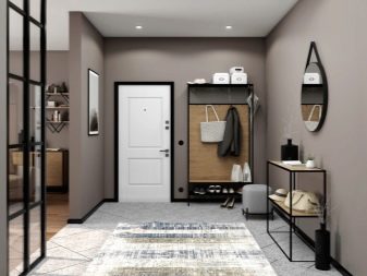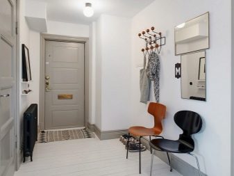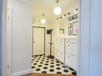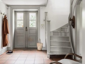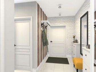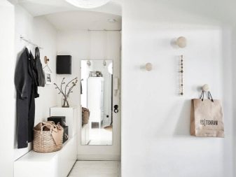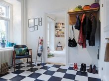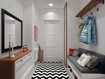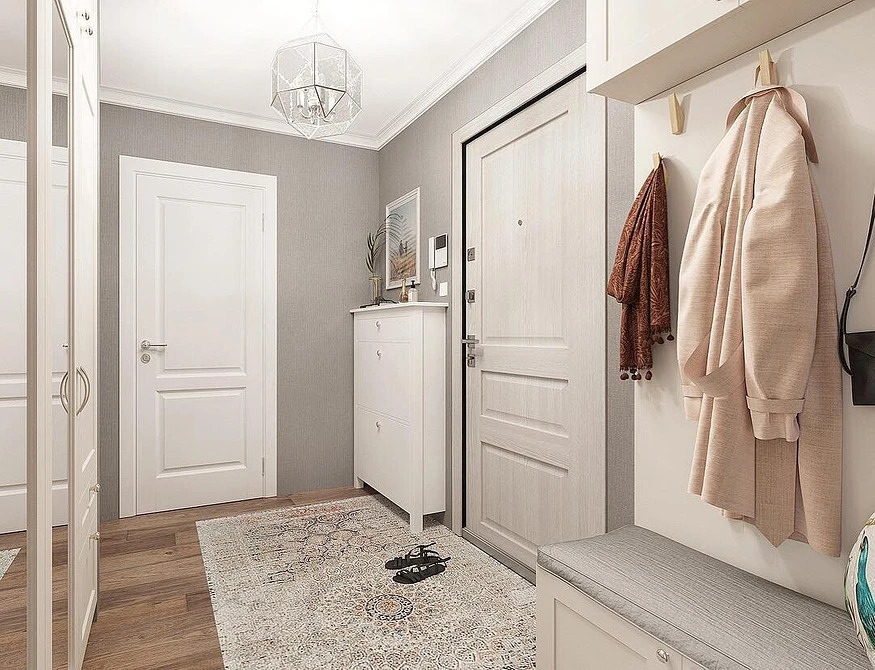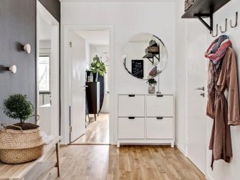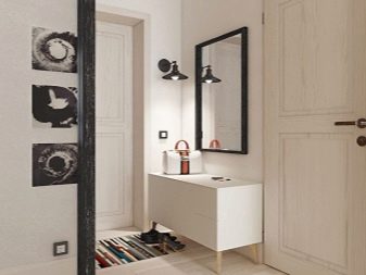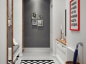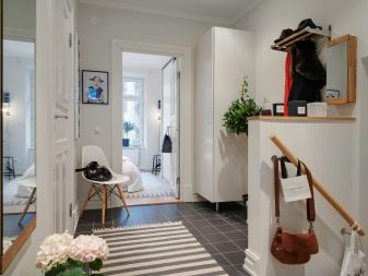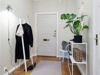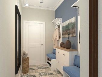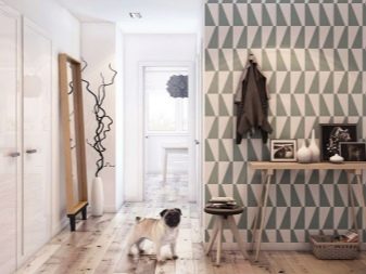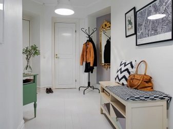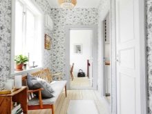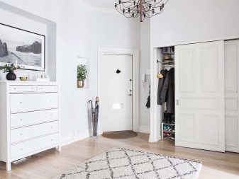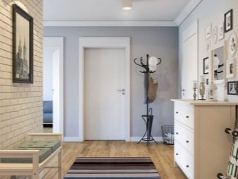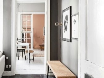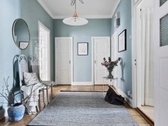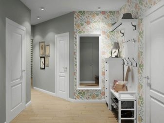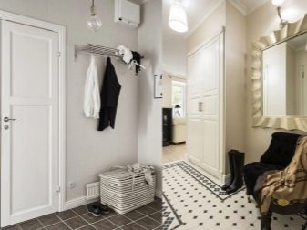 من المعتاد تزيين الممر في الشقة بمواد طبيعية باللون الأبيض أو الرمادي ، مما يكمل ديكور الخلفية بتفاصيل بظلال الباستيل الرقيقة.