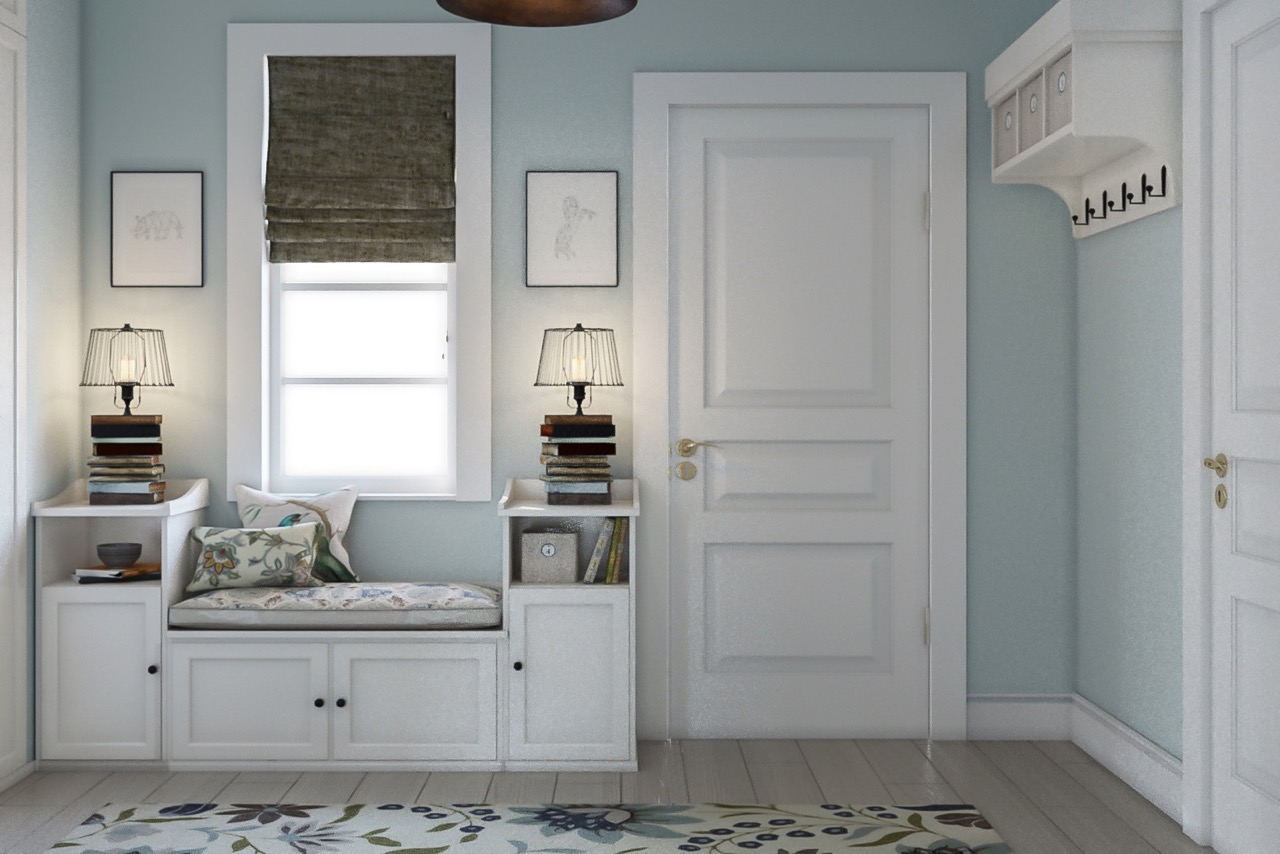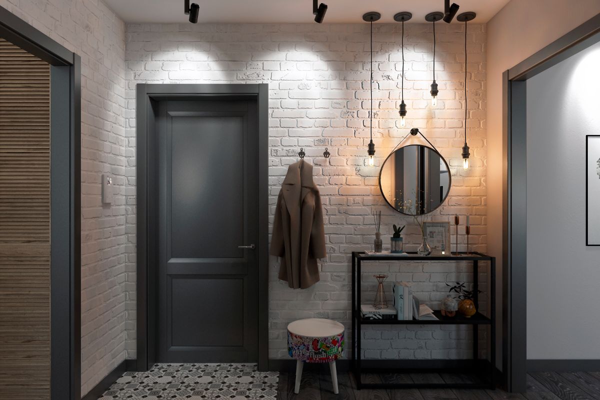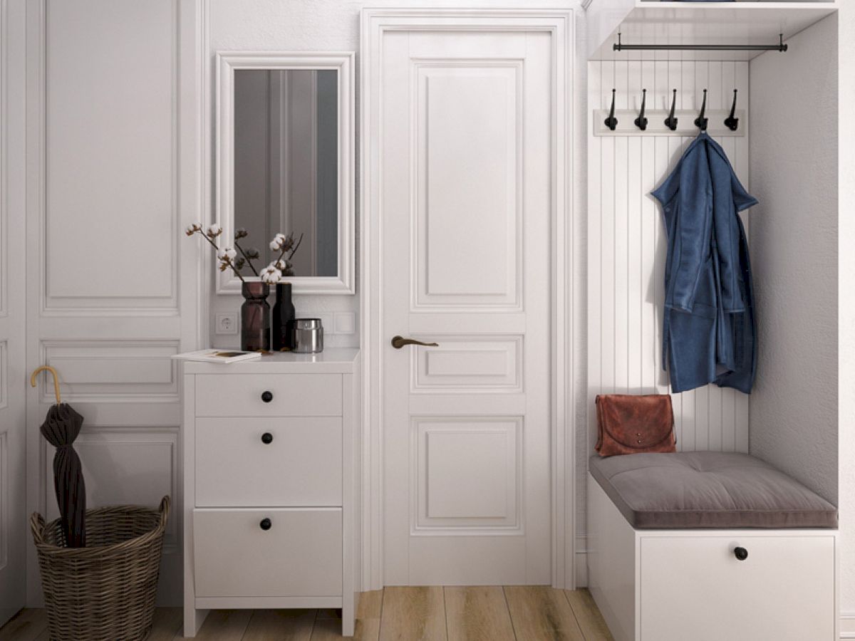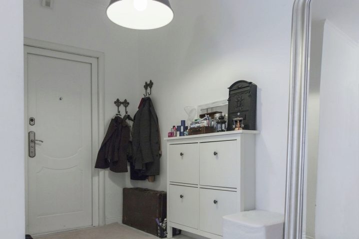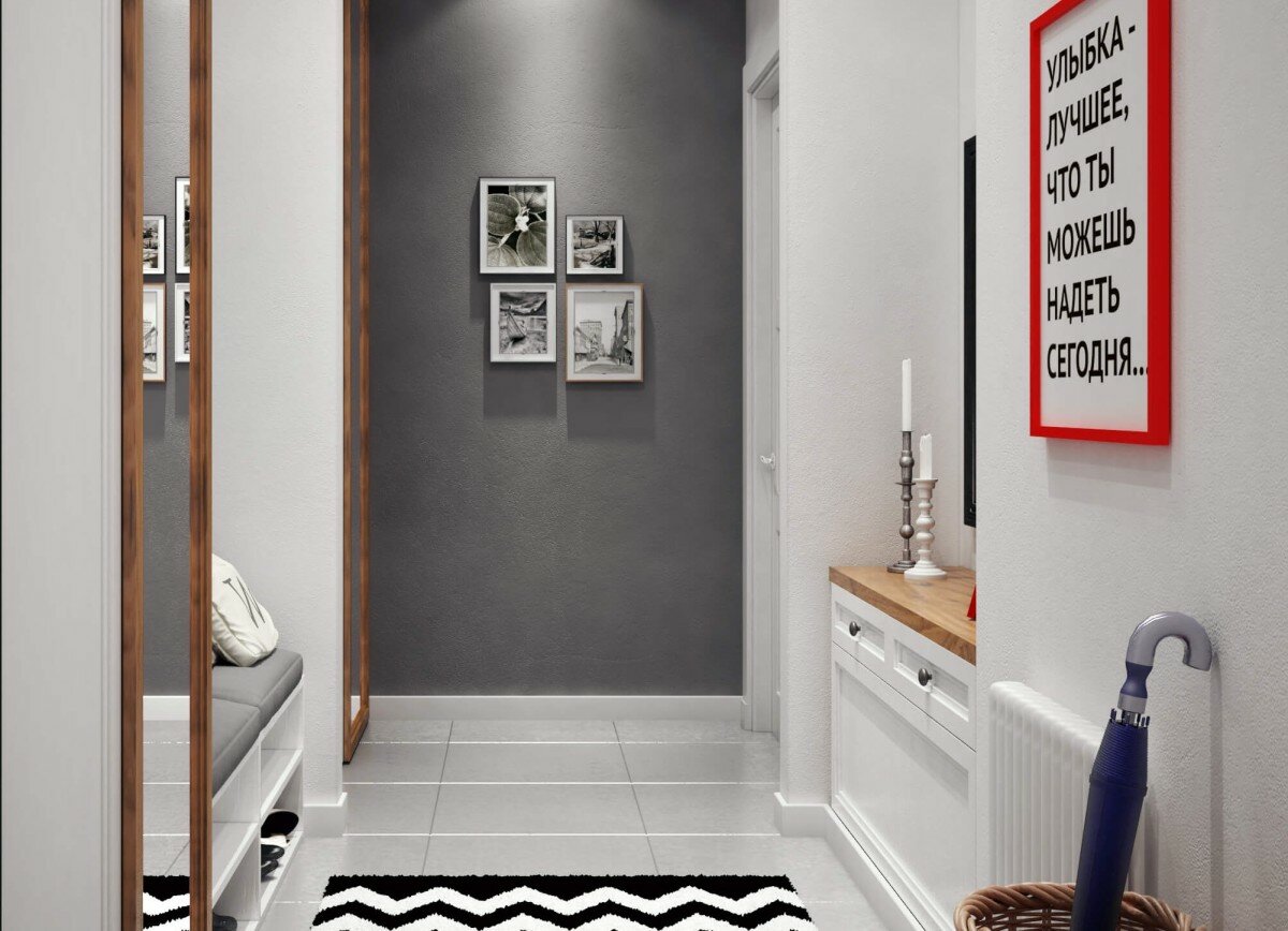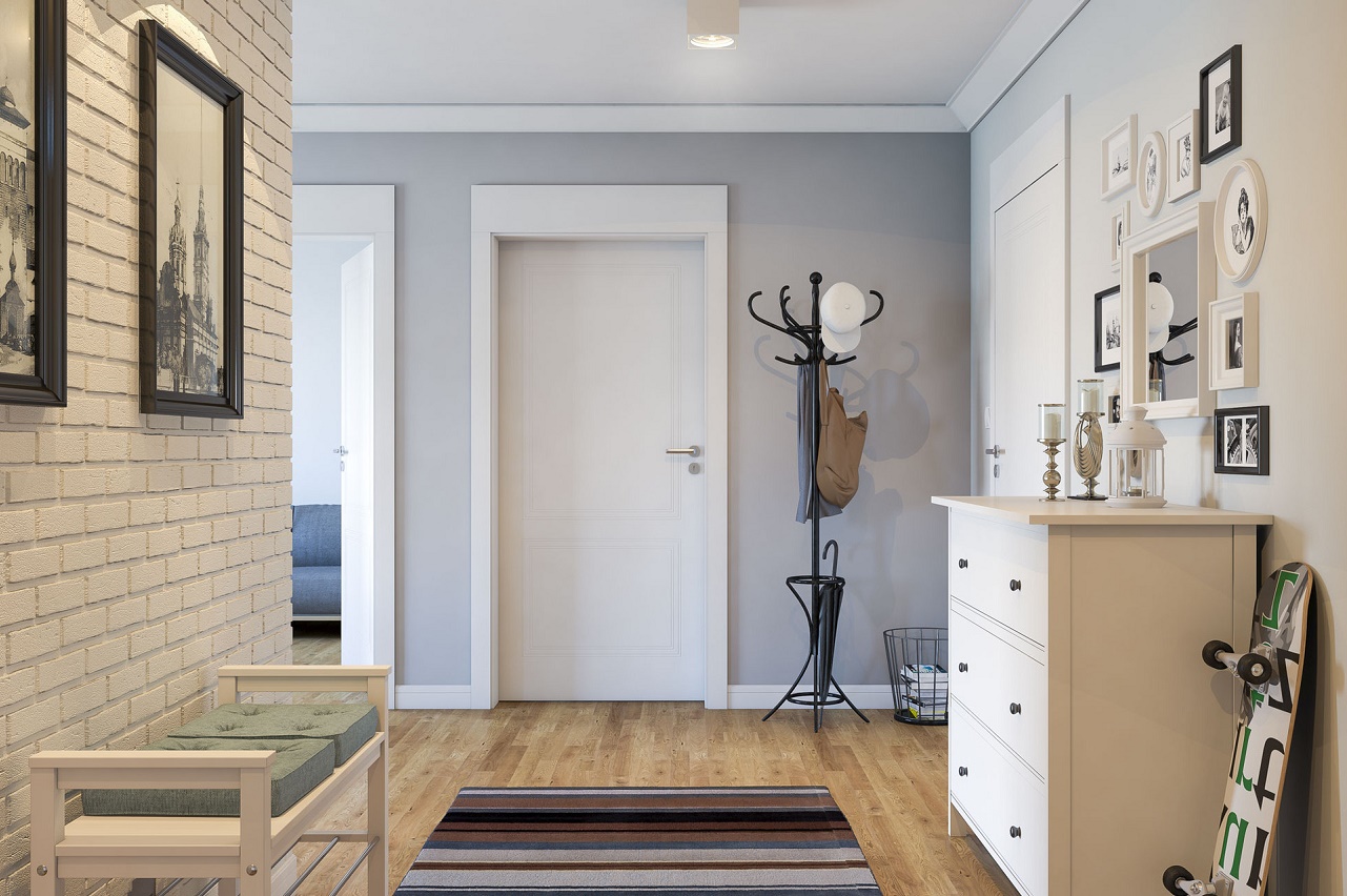 من المعتاد تزيين الممر في الشقة بمواد طبيعية باللون الأبيض أو الرمادي ، مما يكمل ديكور الخلفية بتفاصيل بظلال الباستيل الرقيقة.