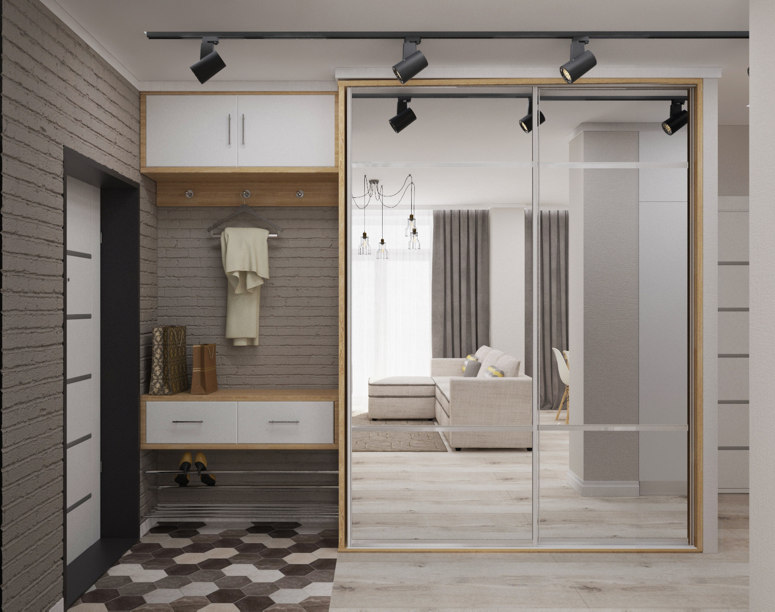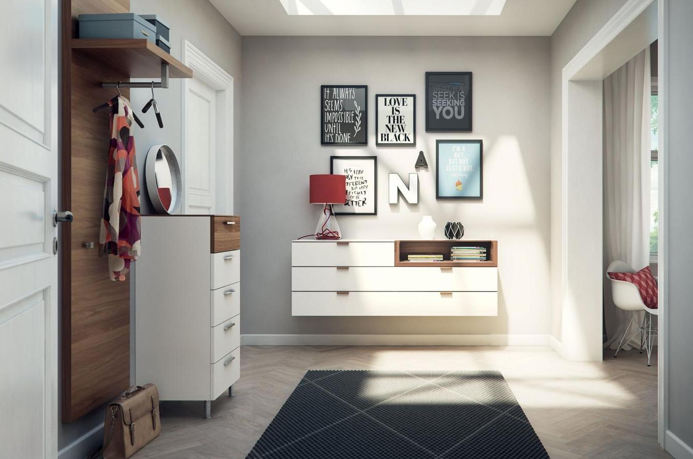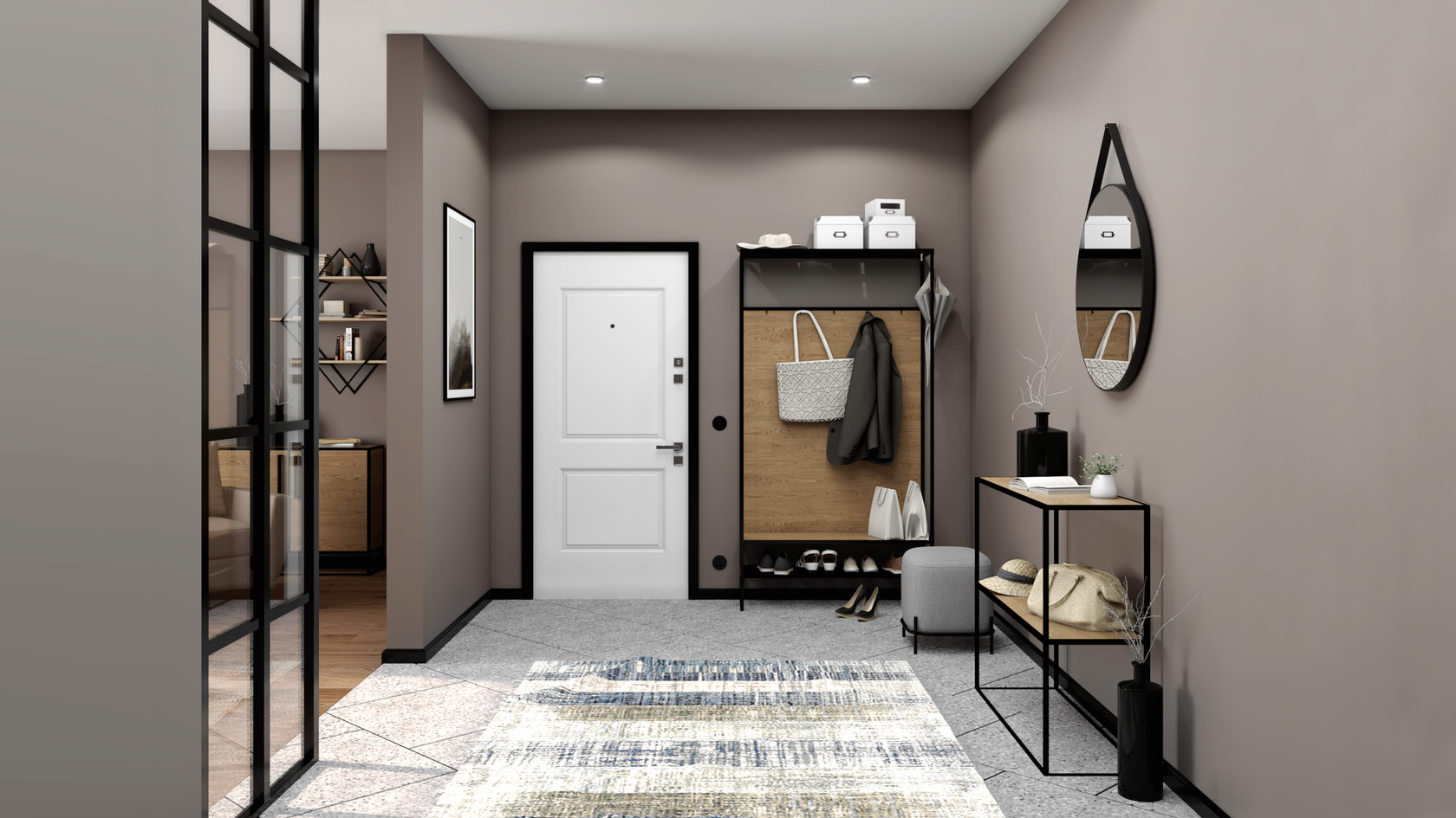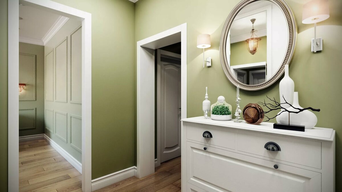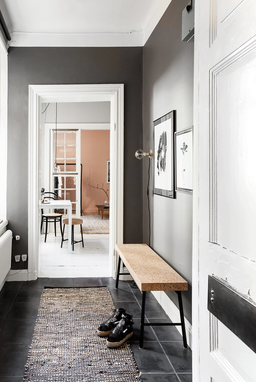 من المعتاد تزيين الممر في الشقة بمواد طبيعية باللون الأبيض أو الرمادي ، مما يكمل ديكور الخلفية بتفاصيل بظلال الباستيل الرقيقة.