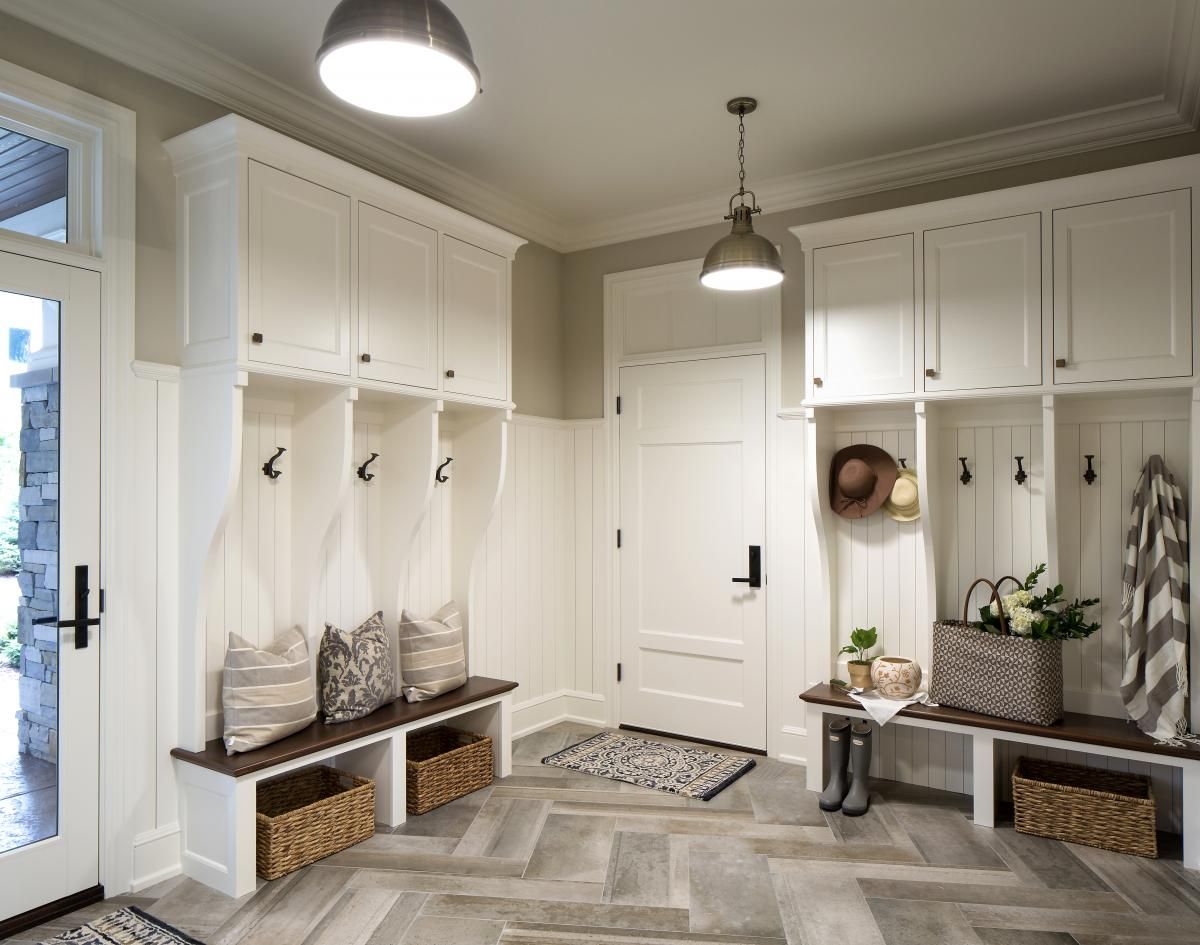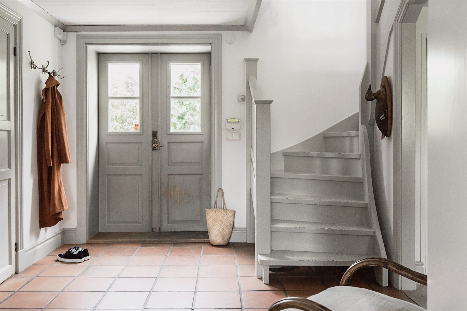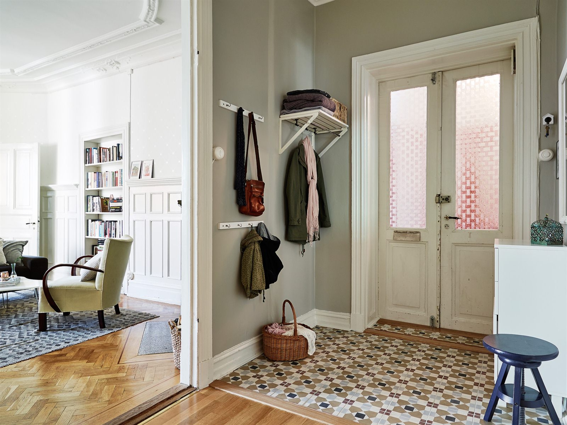 - قاعة مدخل أنيقة بيضاء اللون مع سلال تنظيم تقليدية ورفوف مفتوحة وخزانة ذات أدراج ضيقة... توازن الأرضية المبلطة بين التصميم الداخلي وتجعله متناغمًا.