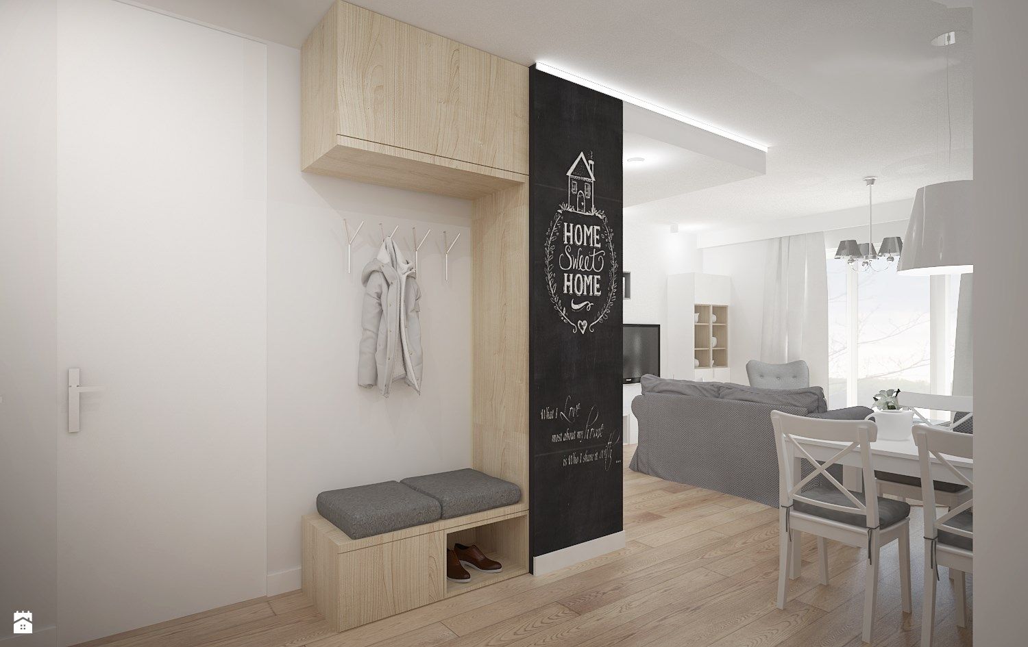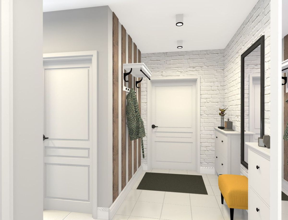 - نموذجي لاتجاه التصميم الاسكندنافي ، مساحة المدخل مع منافذ ، قسم مفتوح من جدار من الطوب ، سجادة صغيرة مصنوعة من مواد طبيعية ومقعد منخفض. الأرضية الخشبية الفاتحة ، والشماعات غير العادية على الحائط ، والنبات الموجود في إناء الأرضية تجعلها غير مملة للغاية.