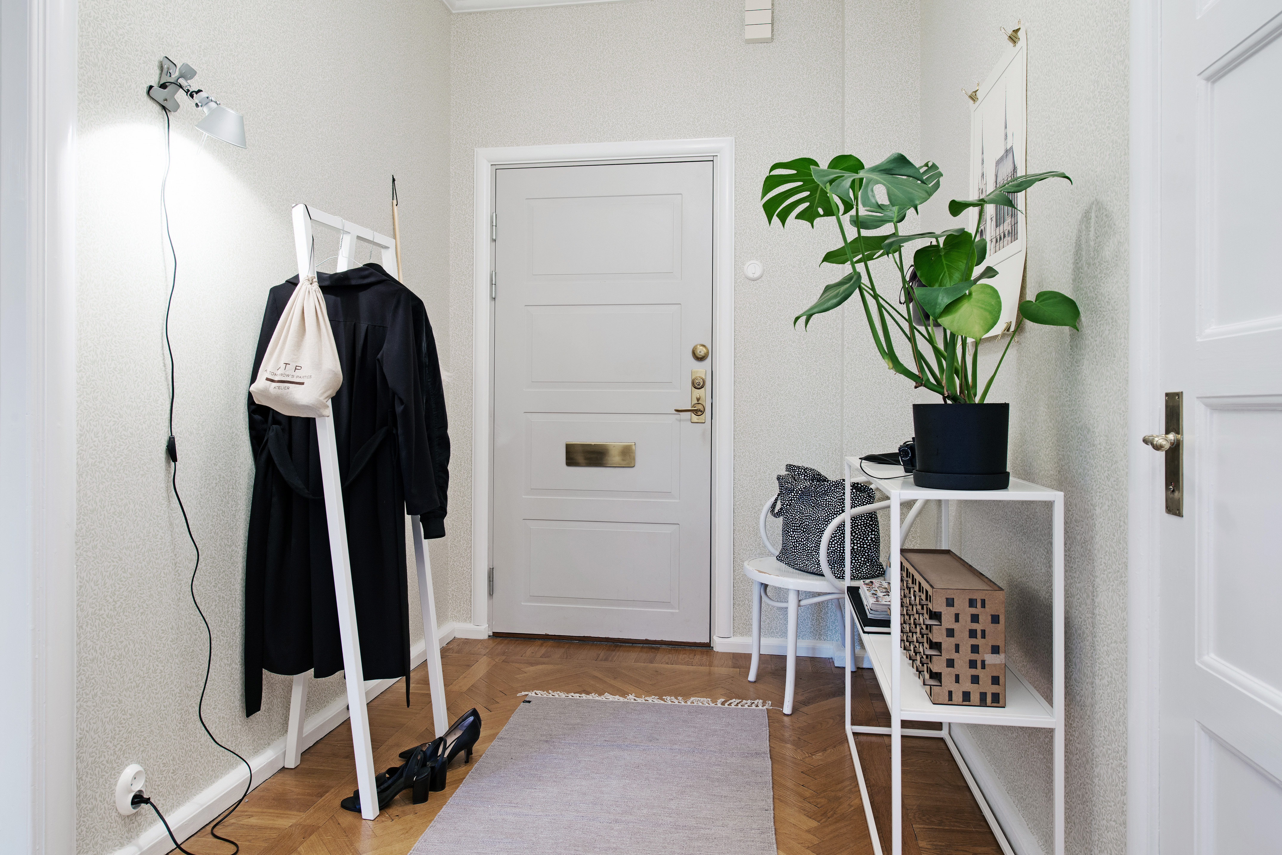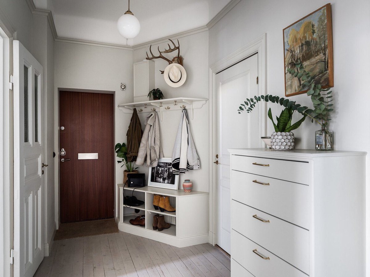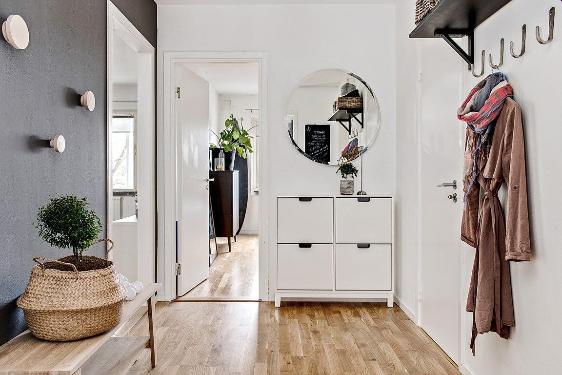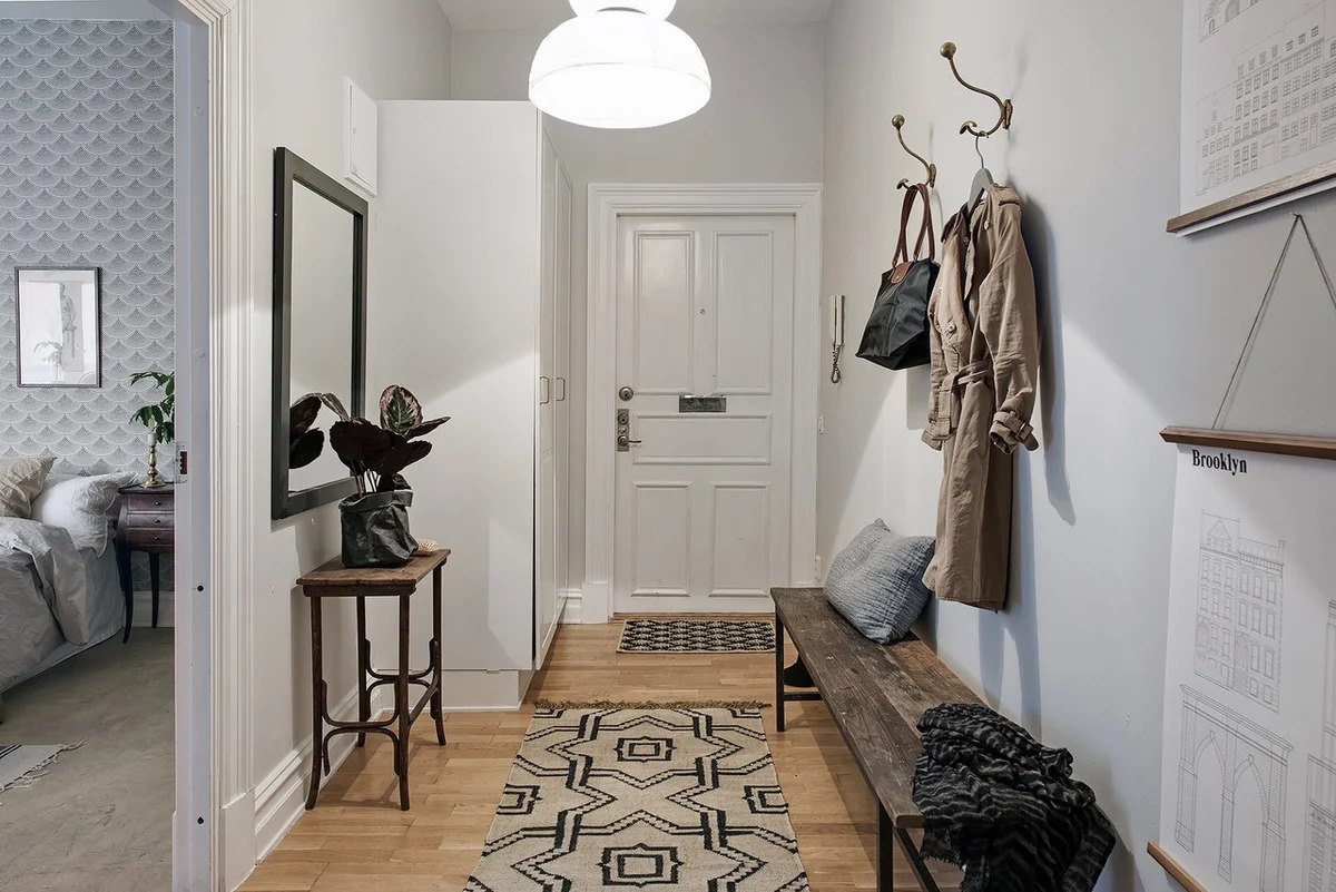 هذا لا يحتاج إلى أن يكون محدودا. يتيح لك الطراز الاسكندنافي إنشاء مساحات داخلية مريحة حتى في منطقة صغيرة... يمكن أن تمتلئ الممرات بالتحف والموروثات العائلية ، مع التركيز على ترتيب المنزل. على سبيل المثال ، يمكنك وضع الشموع في حوامل نحاسية أو برونزية على طاولة ، وساعة منبه بآلية لف في علبة مضيئة.