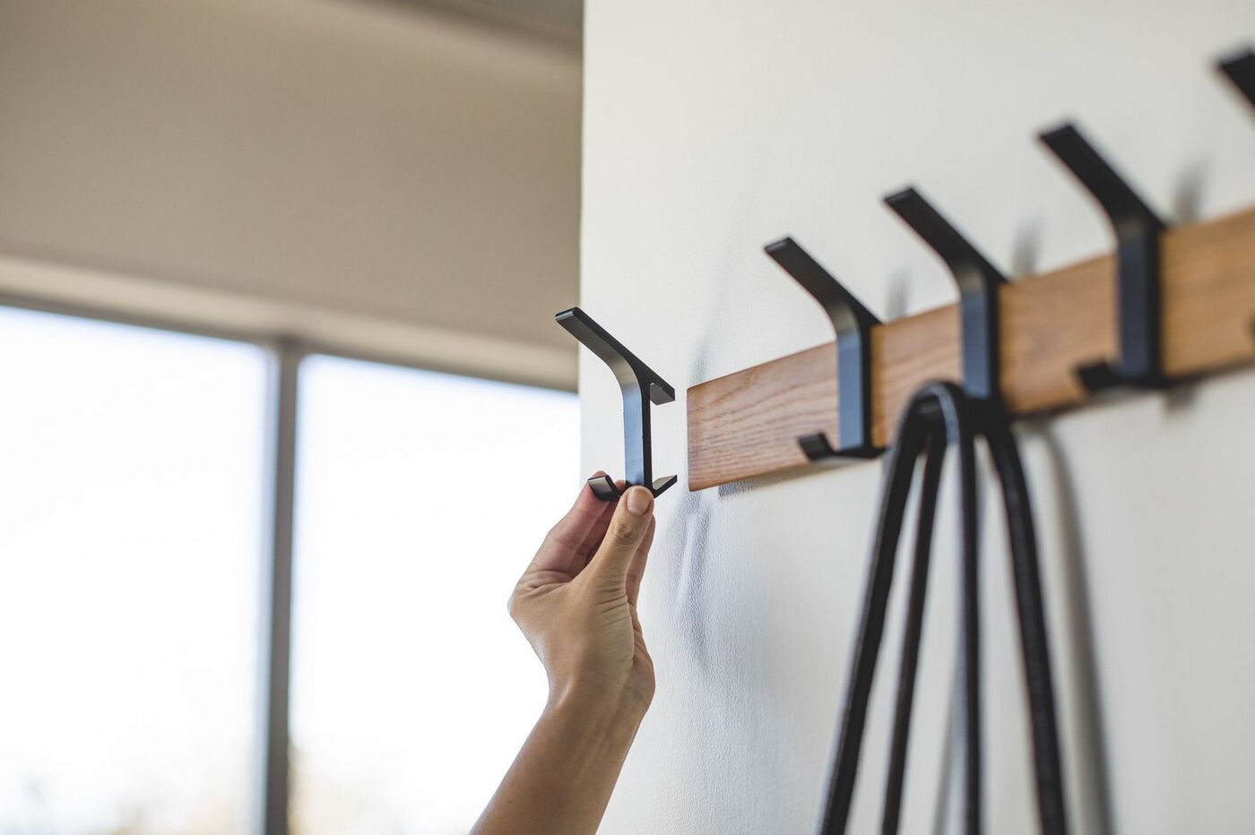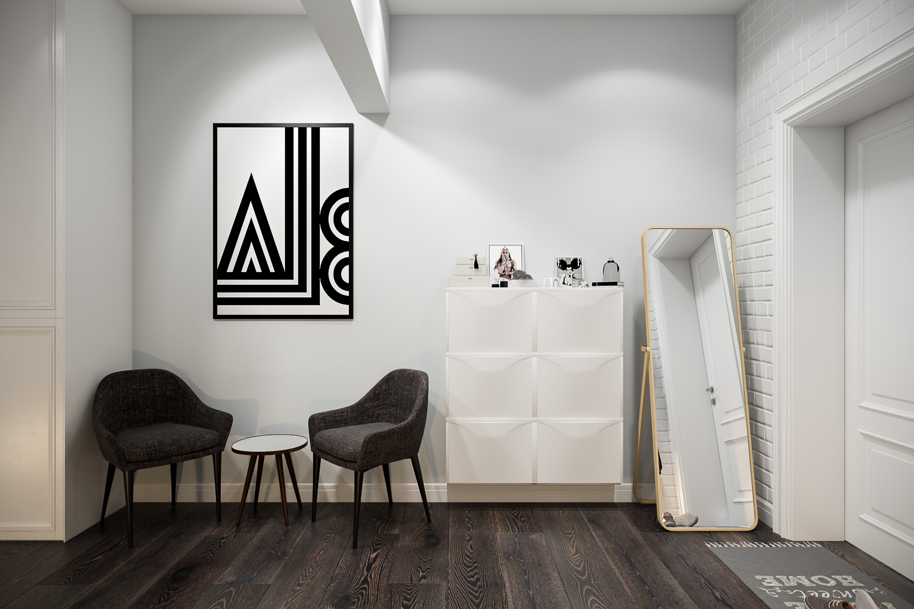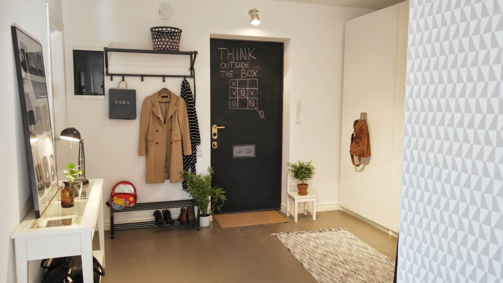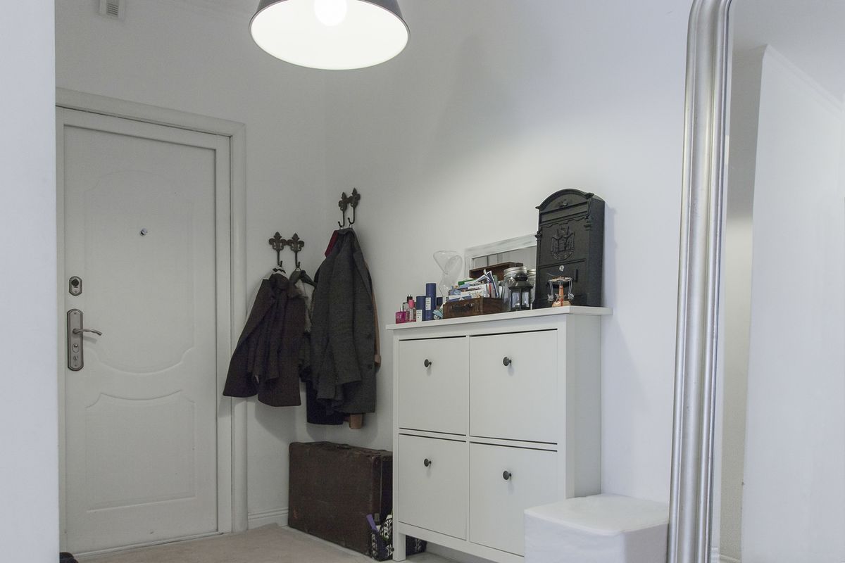 مثال صارخ على رواق لا يوجد فيه شيء غير ضروري... أرضيات خشبية بسيطة مع نسيج طبيعي من المواد ، شماعات أصلية تشبه رؤوس الأظافر ، لوحات تجريدية على الجدران. إنه يحتوي على كل ما تحتاجه لتشعر وكأنك في المنزل بعد يوم طويل.