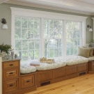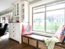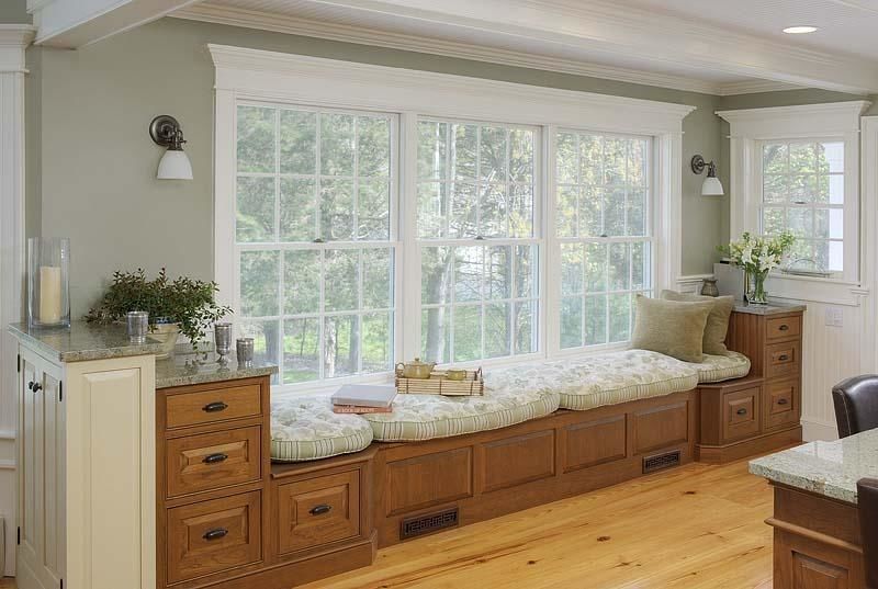 أفضل الخيارات لإعادة البناء - نوافذ كبيرة... يمكن هنا إنشاء مناطق ترفيهية وظيفية. يمكن أن تكون هذه أرائك مع صندوق مغلق أو رفوف ، ومقاعد خفيفة ذات مقاعد ناعمة.