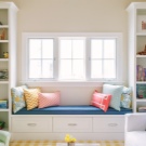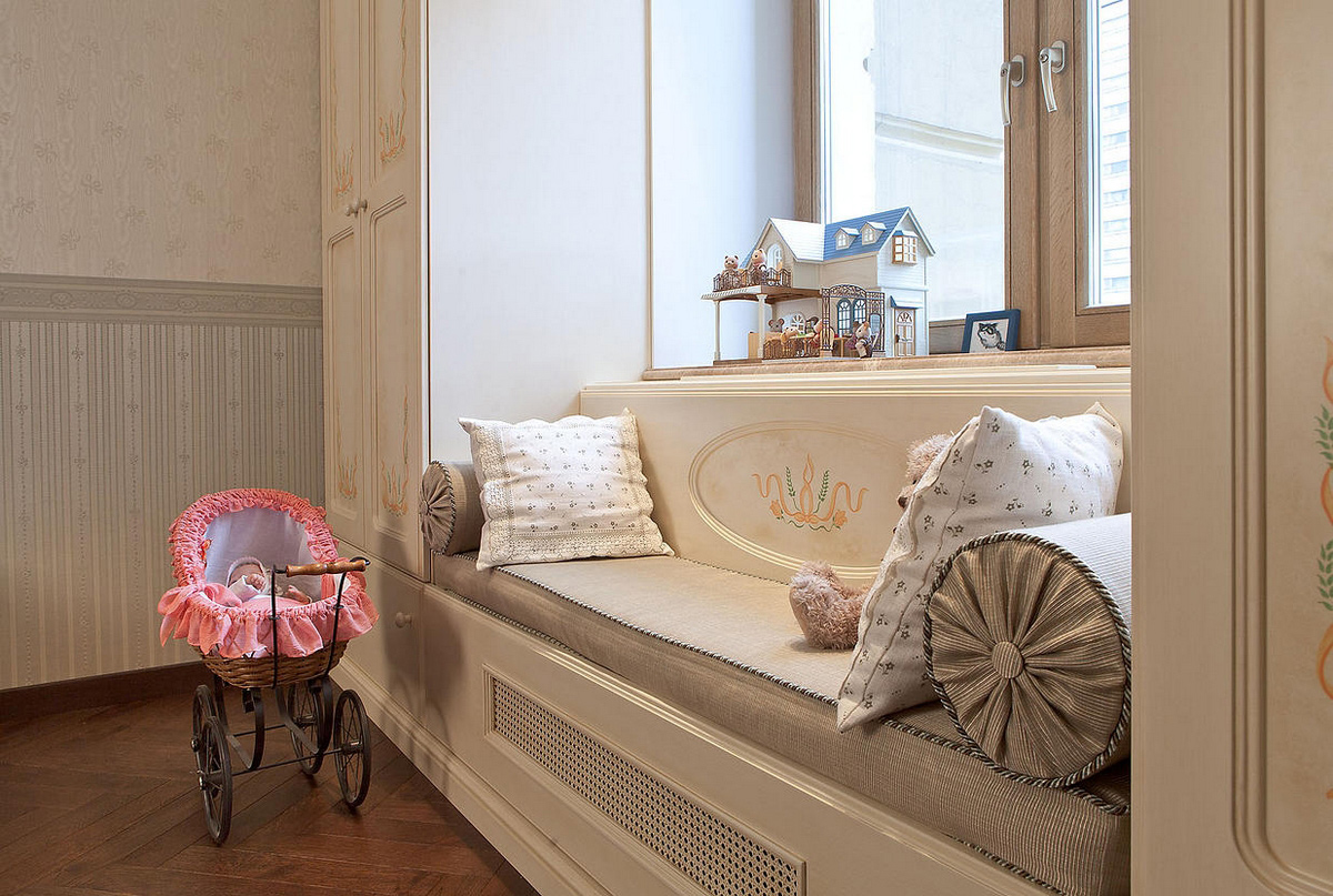 إذا كانت الغرفة فسيحة ، فإن الأمر يستحق استخدام عتبة النافذة لصنع أريكة عائلية ، لا يمكنك الاسترخاء عليها فحسب ، بل يمكنك أيضًا اللعب للأطفال. سيصبح هذا المكان نوعًا من الملعب ومقرًا للأطفال.