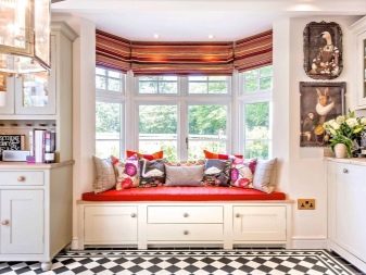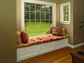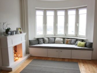بالإضافة إلى ذلك ، تم تقليد أرائك عتبة النافذة. من الأسهل بكثير عمل مثل هذه التصميمات. لإنشاء منطقة ترفيهية ، يكفي إعطاء منظور الغرفة حدودًا معينة.