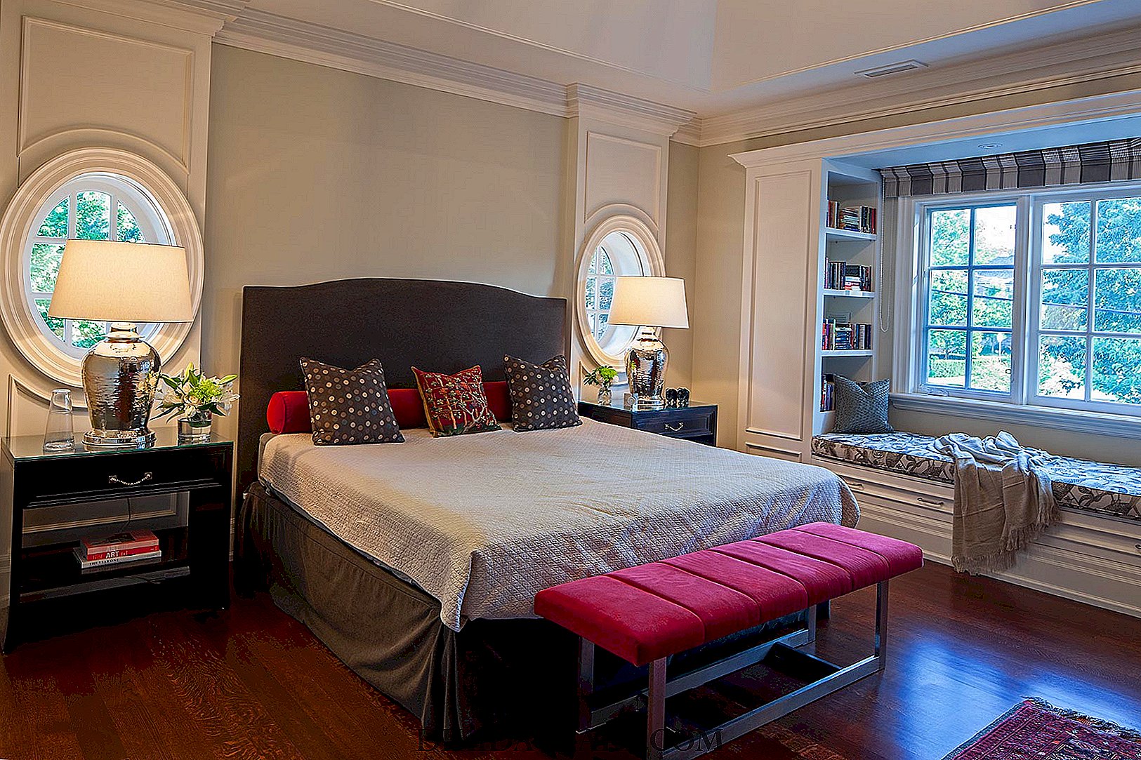 تم تزيين عتبة الأريكة في غرفة النوم بطرق مختلفة. هنا يمكنك إنشاء جزيرة صغيرة من الاسترخاء. إذا كانت النوافذ منخفضة ، يمكن أن تكون المنصة هي القاعدة.