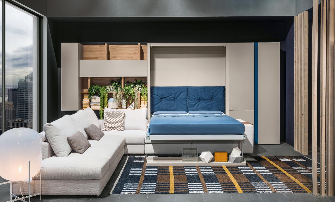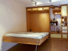 خيار آخر مثير للاهتمام لغرفة المعيشة. خلال النهار هي خزانة ملابس مدمجة ، وفي الليل تتحول إلى مكان نوم كامل. من المستحيل تمامًا تخمين أن السرير مخفي في مكانه المناسب.