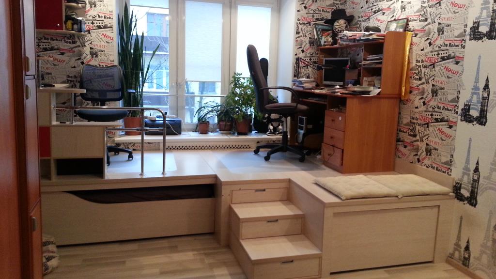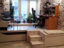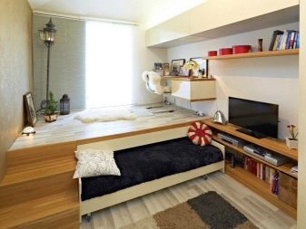 بمساعدة المنصة ، يمكنك تقسيم مساحة الغرفة إلى مناطق. على سبيل المثال ، قم بتنظيم مكان عمل أو غرفة طعام في الجزيرة الناتجة. ينزلق السرير نفسه أسفل المنصة ، لذلك من الضروري ترك مساحة كافية لينزلق بحرية.
