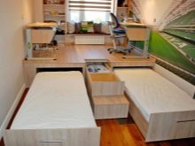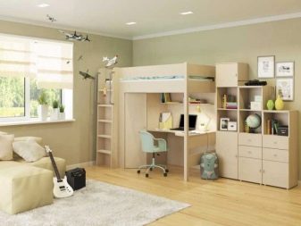 ليس خيارًا سيئًا لغرفة المراهق أو الطالب. يختبئ السرير الموجود على آلية الرفع في مكان مناسب ، مما يترك الغرفة خالية. في الوقت نفسه ، يعمل الهيكل بأكمله كمجموعة واحدة: لا تشتمل المجموعة على خزانة ملابس ورفوف فحسب ، بل تشمل أيضًا طاولة مدمجة.