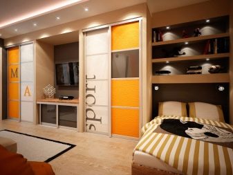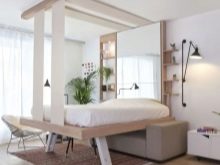 إذا كنت ترغب في تقسيم شقة الاستوديو إلى غرف منفصلة ، بحيث تكون هناك غرفة نوم ، فيمكنك تركيبها قسم خزانة الملابس. هذا الجدار أكثر وظيفية. وإخفاء الأبواب كجدار أو خزانة ملابس ، وإخفاء مكان النوم عن أعين المتطفلين ، وتوفير الخصوصية.