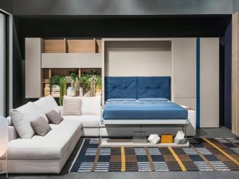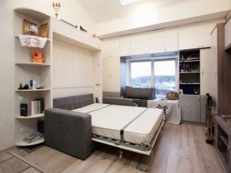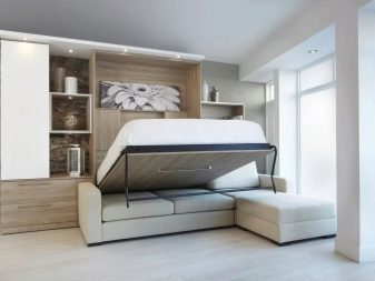مثير للإعجاب نماذج مع أرائك ، يسقط ظهره ، ويتحول إلى سرير في الليل. هذا التصميم مثير للاهتمام حيث أنك لا تحتاج إلى الاستغناء عن مرتبة تقويم العظام المريحة لصالح أريكة عالمية قابلة للطي لتوفير مساحة في الغرفة. هذا ينطبق بشكل خاص على الشقق الصغيرة.