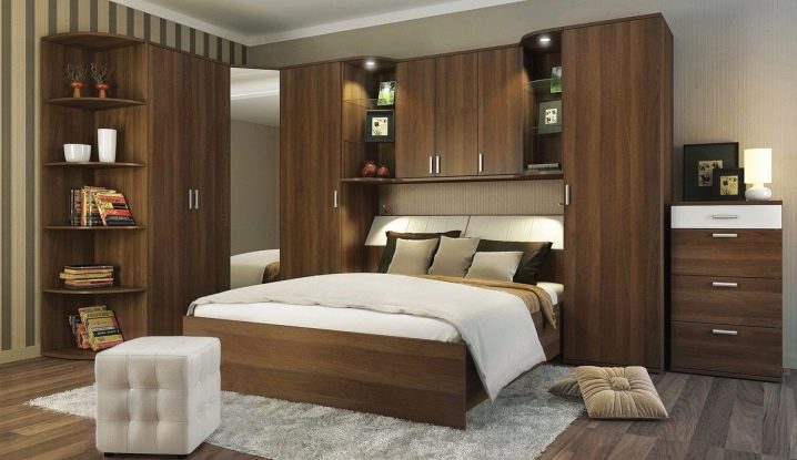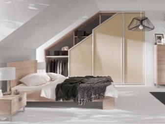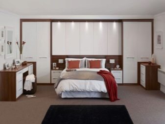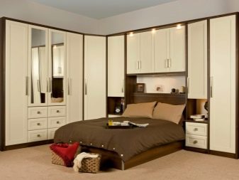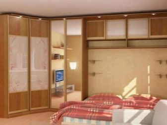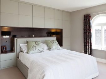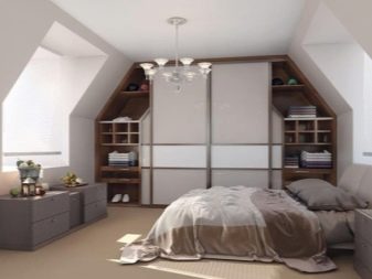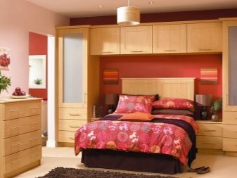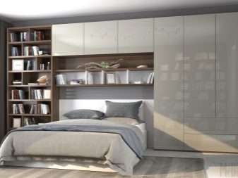 نوع آخر شائع من أثاث غرف النوم المدمجة هو خزائن وميزانين... إنها تسمح لك بتنظيم أكبر عدد ممكن من أنظمة التخزين في مساحة محدودة. هناك ركن ، كامل الجدار أو يقع في مكانه.