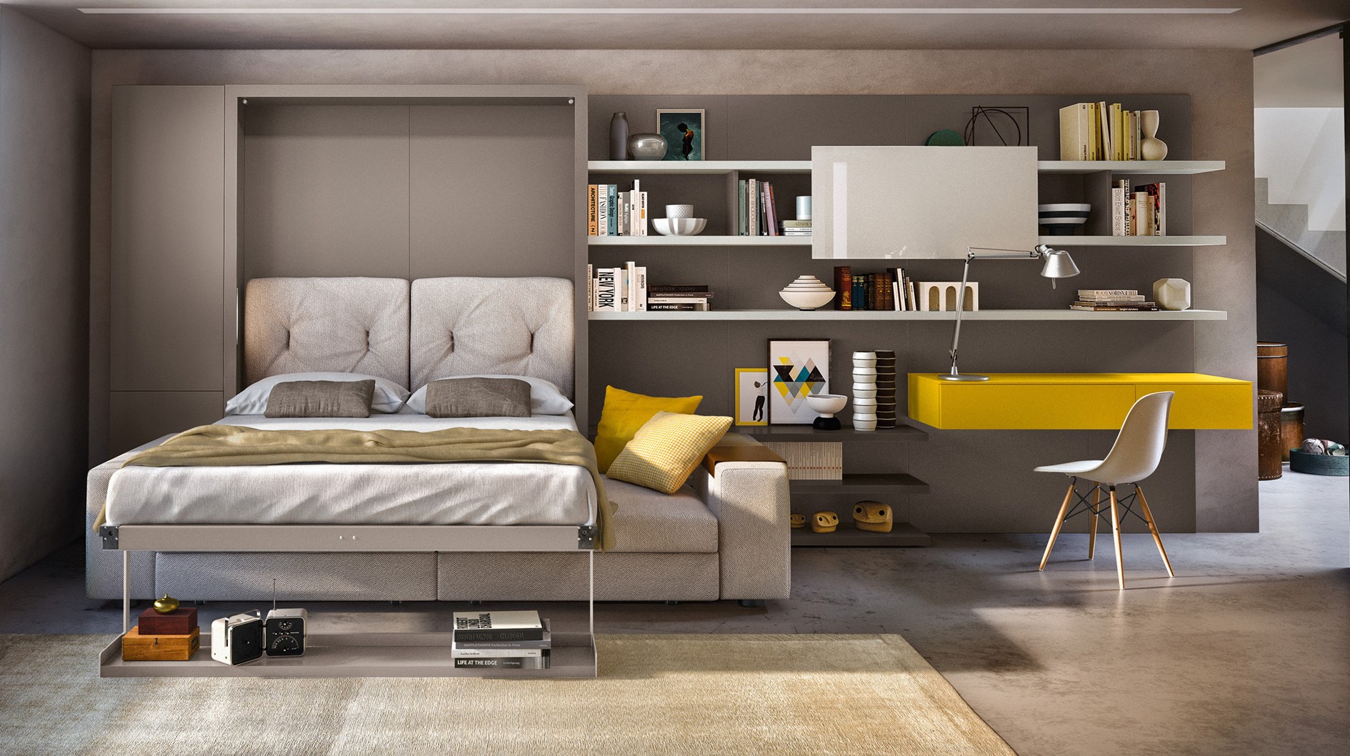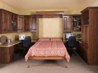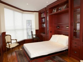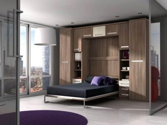 يمكن تقسيم الأثاث المدمج المشروط إلى مجموعات غرف نوم كاملة وأنواع معينة من الأثاث المحول. تعتبر سماعات الرأس مريحة من حيث أنها تقوم على الفور بتجهيز الغرفة بالكامل بأداء أسلوبي واحد. ليست هناك حاجة لإضاعة الوقت والجهد في البحث عن أثاث مناسب للهياكل المدمجة بالفعل. خزانات الملابس تأتي بالفعل مع سرير مدمج. لكن التكلفة مرتفعة أيضًا.