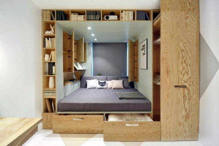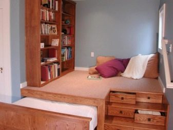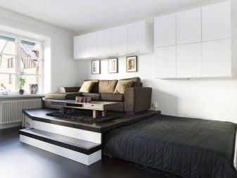 سرير المنصة يسمح لك برفع السرير أو إخفائه تمامًا. في الحالة الأولى ، يقع الرصيف على المنصة نفسها. يتم تنظيم أنظمة التخزين تحتها ، وغالبًا ما تكون عبارة عن أدراج مغلقة. على جانبي المنصة ، يمكنك أيضًا ترتيب العديد من الخزائن والأرفف ، وبالتالي إخفاء السرير في مكانه المناسب.